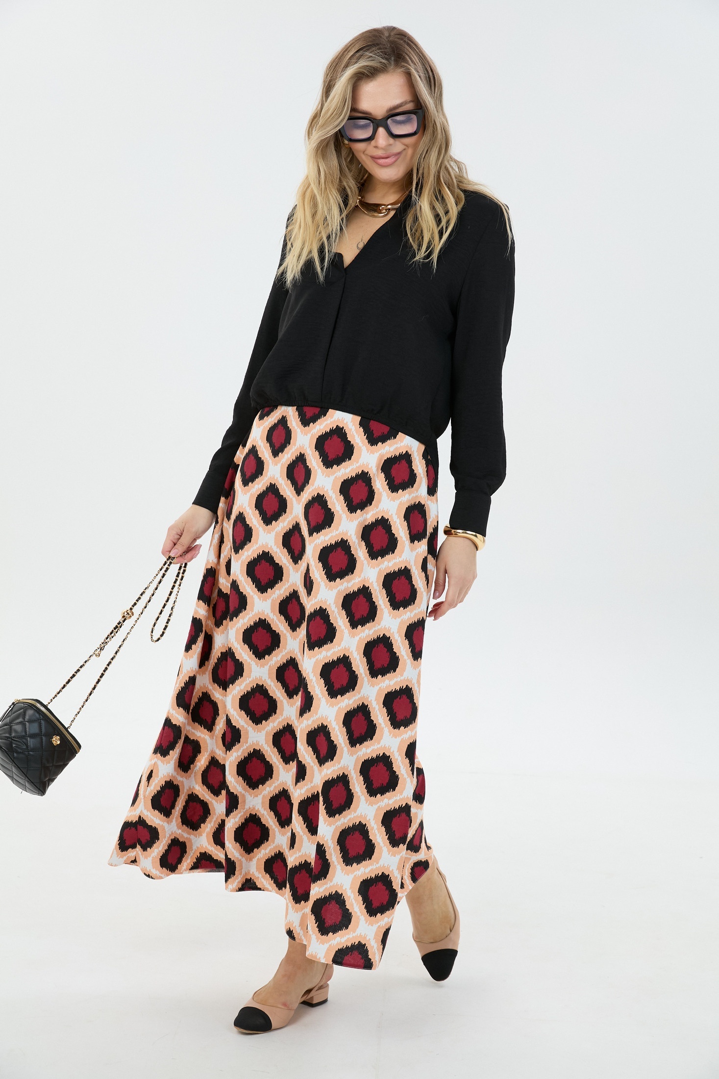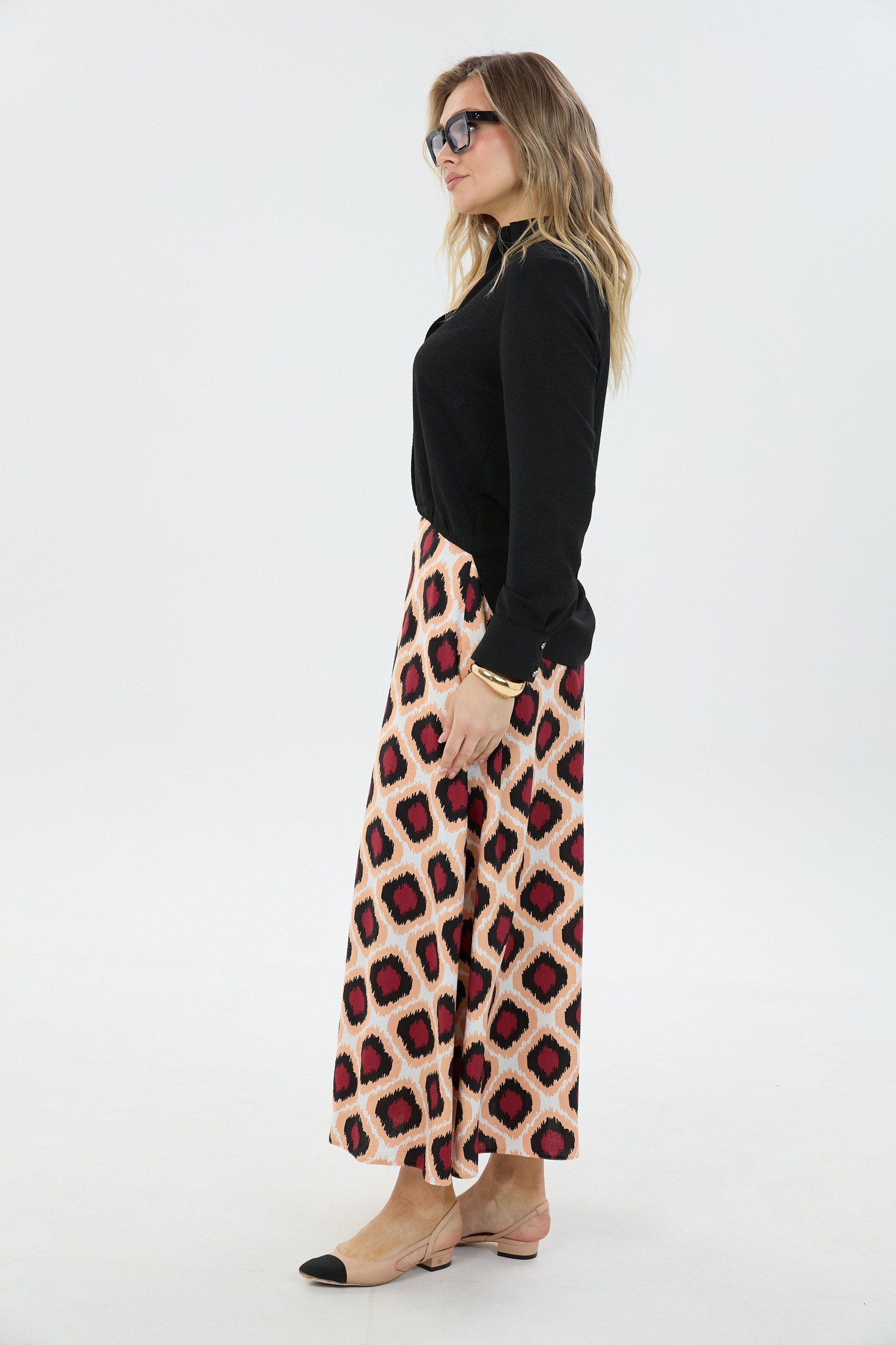 Костюм с юбкой К1870114 ромбы LM от Лаборатории моды представляет собой стильный комплект из блузки и юбки. В коллекции бренда Лаборатория моды акцент сделан на сочетание комфорта и моды. Блузка выполнена из ткани, содержащей 25% вискозы и 75% полиэстера, что придаёт ей легкость и воздухопроницаемость. Свободный силуэт с асимметричным низом дополнен V-образным вырезом и рубашечным воротником, делая модель подходящей для офисного или повседневного стиля. Манжеты с застёжкой на пуговицы добавляют классической строгости. Юбка кроя «трапеция» из смеси 15% вискозы, 25% нейлона и 60% полиэстера обеспечивает комфорт благодаря эластичному поясу сзади и потайной молнии сбоку. Геометрический узор ромбами подчеркивает женственность и оригинальность. Подходит для тёплого сезона благодаря своим материалам и крою.