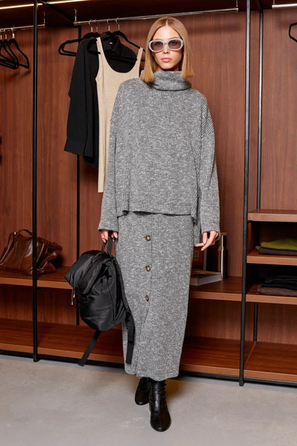 Комплект юбочный, выполненный из нежнейшего хлопкового трикотажа. Джемпер свободного силуэта, рукав длинный, со спущенной линией плеча. Воротник – широкая стойка. Джемпер удлиненный со стороны спинки. Юбка длины миди, по всей длине выполнена застежка на петли пуговицы, пояс на резинке.