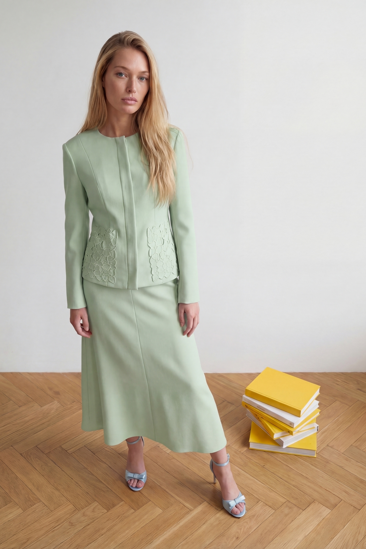 Костюм с юбкой 1852 фисташковый Lokka — это стильный комплект из жакета и юбки, выполненный в коллекции бренда Lokka. Жакет полуприлегающего силуэта на подкладке, с потайной застежкой на пуговицы и элегантной вышивкой в стиле «Ришелье» на накладных карманах. Он обладает округлым вырезом и шлицей по локтевому шву. Длина по спинке составляет 56 см, а длина рукава — 60 см. Юбка А-силуэта с притачным поясом и потайной молнией спереди, длиной 92 см. Этот костюм идеально подходит для офисного или делового стиля в теплое время года. Цвет фисташковый добавляет свежести и легкости в образ. Изготовлен из смеси полиэстера, вискозы и спандекса для комфортной посадки и свободы движений.