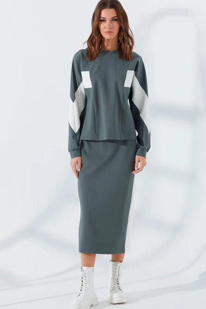 Юбка прямого силуэта. Верхний срез обработан притачным поясом на резинке. На заднем полотнище вытачки и средний шов, переходящий в разрез. По боковым швам располагаются контрастные декоративные вставки.