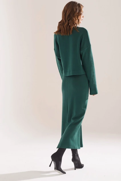 Комплект женский состоит из джемпера и юбки, выполненный из трикотажа. Укороченный джемпер свободного силуэта. Горловина округлая. Рукав со спущенной линией плеча удлиненный. Юбка прямого силуэта. По поясу резинка, по спинке средний шов переходящий в разрез. Длина изделия джемпера: 48см(44-48р) 56см(50-54р) 64см(56-60р)