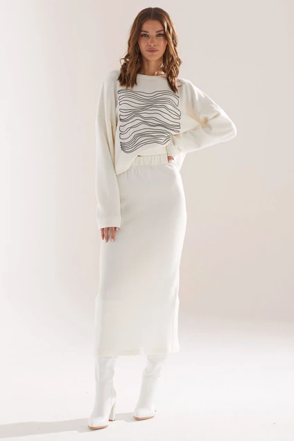 Комплект женский состоит из джемпера и юбки, выполненный из трикотажа. Укороченный джемпер свободного силуэта. Горловина округлая. Рукав со спущенной линией плеча удлиненный. Юбка прямого силуэта. По поясу резинка, по спинке средний шов переходящий в разрез. Рост 164-170 Длина изделия джемпера: 48см(44-48р) 56см(50-54р) 64см(56-60р)
