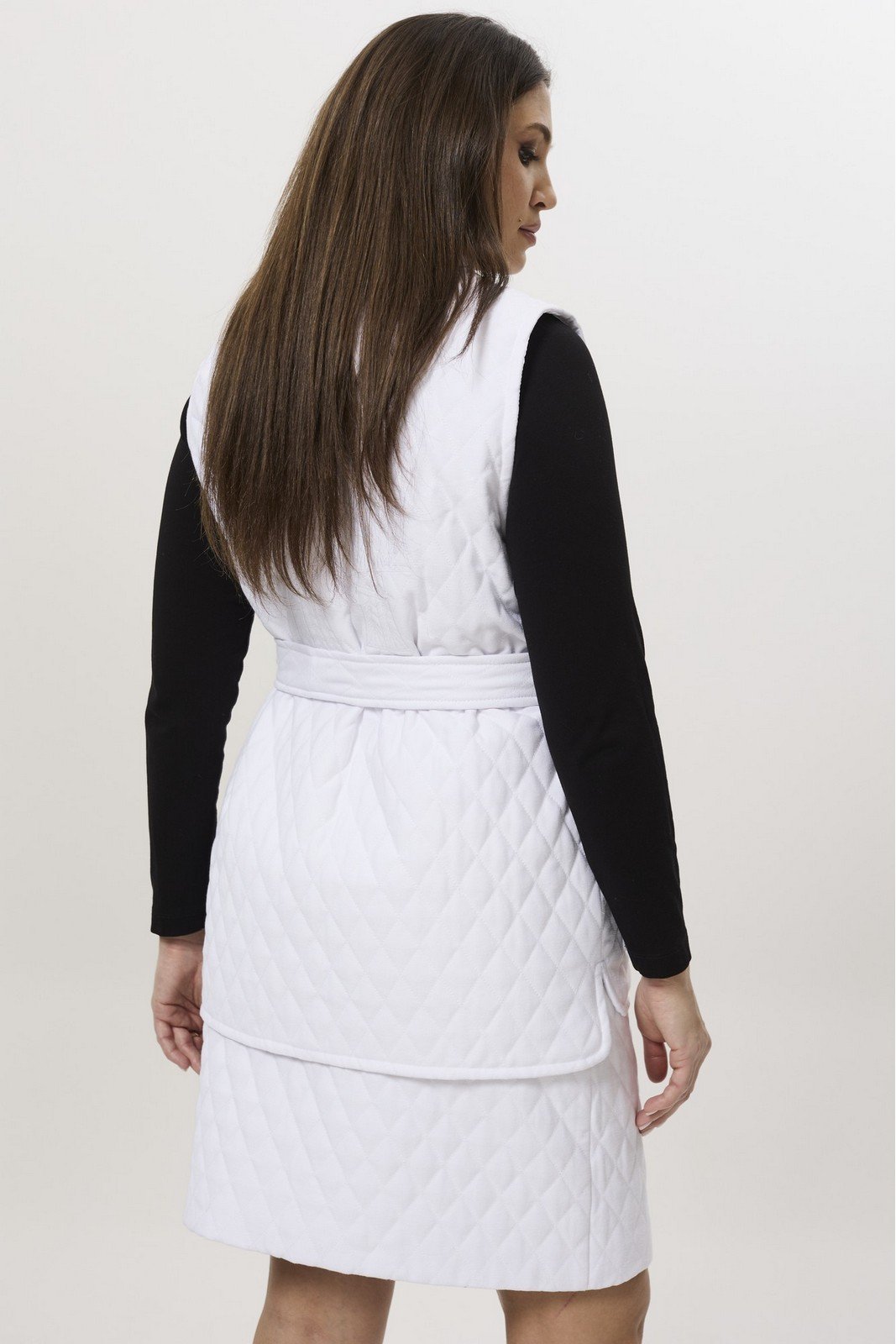 Жилет прямого силуэта на подкладке. Воротник пиджачного типа, застежка центральная однобортная на одну петлю и пуговицу. Полочка с функциональными накладными карманами. Спинка цельная, немного длиннее полочки. В боковом шве разрез. Жакет слегка утеплен.