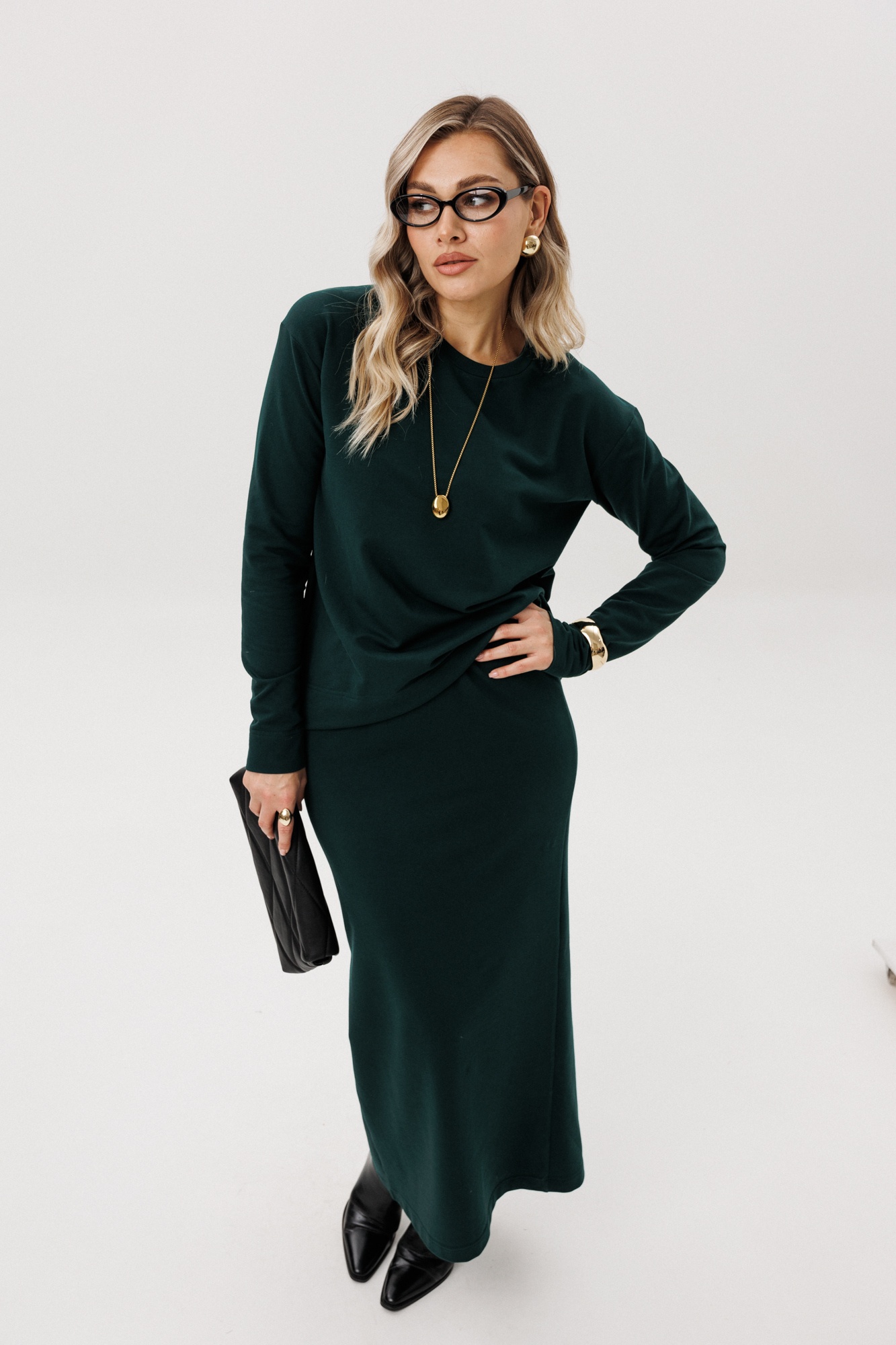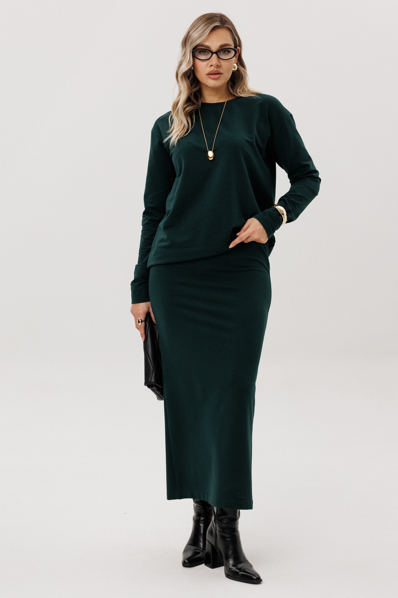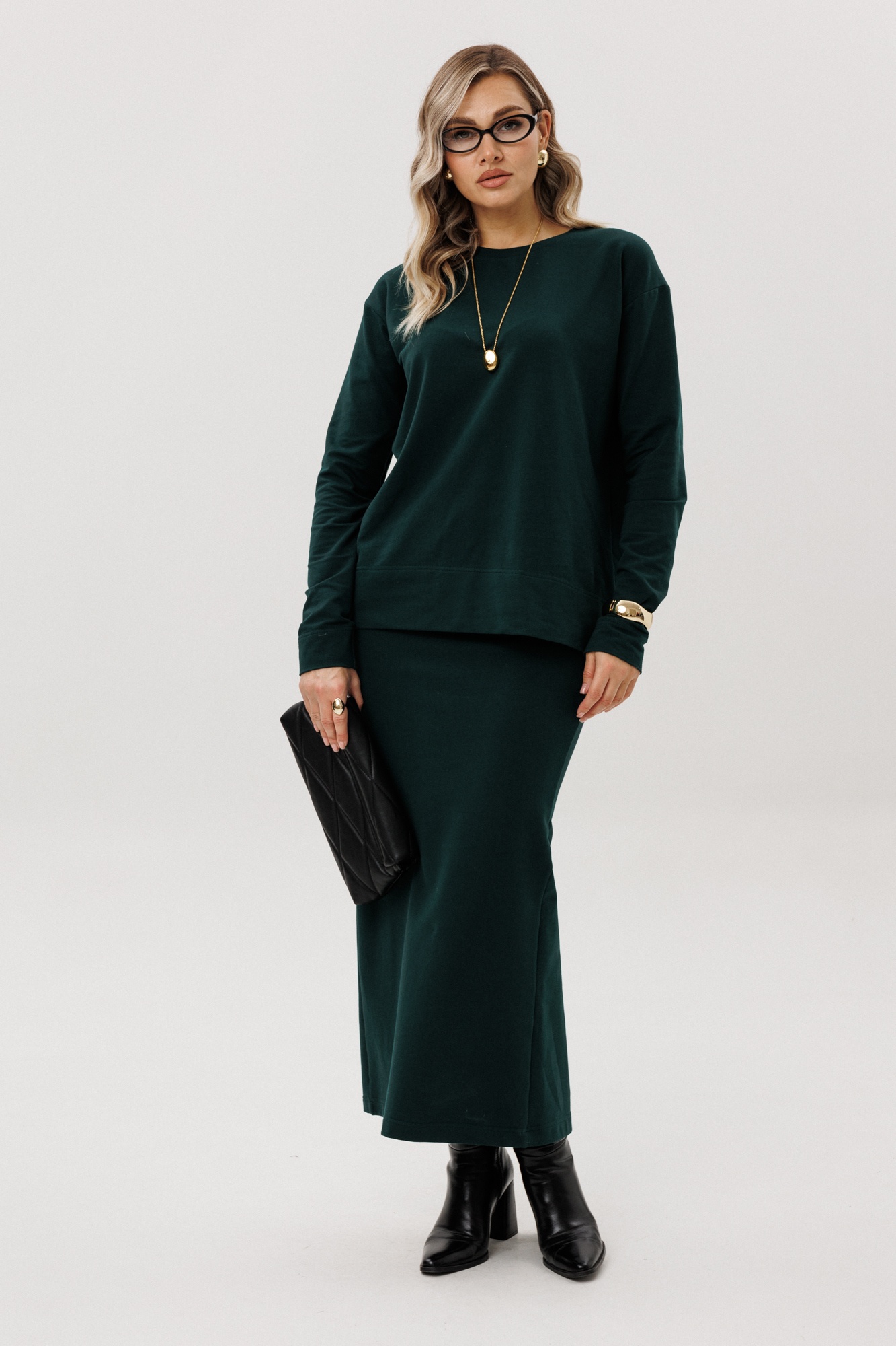 Элегантный двухпредметный костюм насыщенного зеленого цвета, который добавит изысканности любому гардеробу. Джемпер выполнен в свободном крое с длинными рукавами, объединяющий комфорт и стиль. Прямая юбка длиной до середины икры с элегантным разрезом на задней половинке, усиленным тесьмой, подчеркивает стройность силуэта. Эластичная тесьма на талии обеспечивает идеальную посадку и комфорт в течение всего дня. Этот костюм идеален для создания образа, который требует одновременно строгости и модной непринужденности.