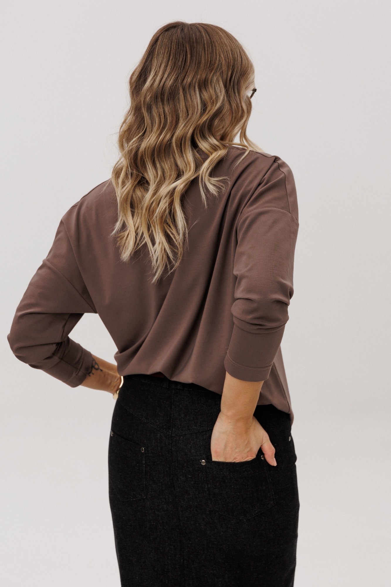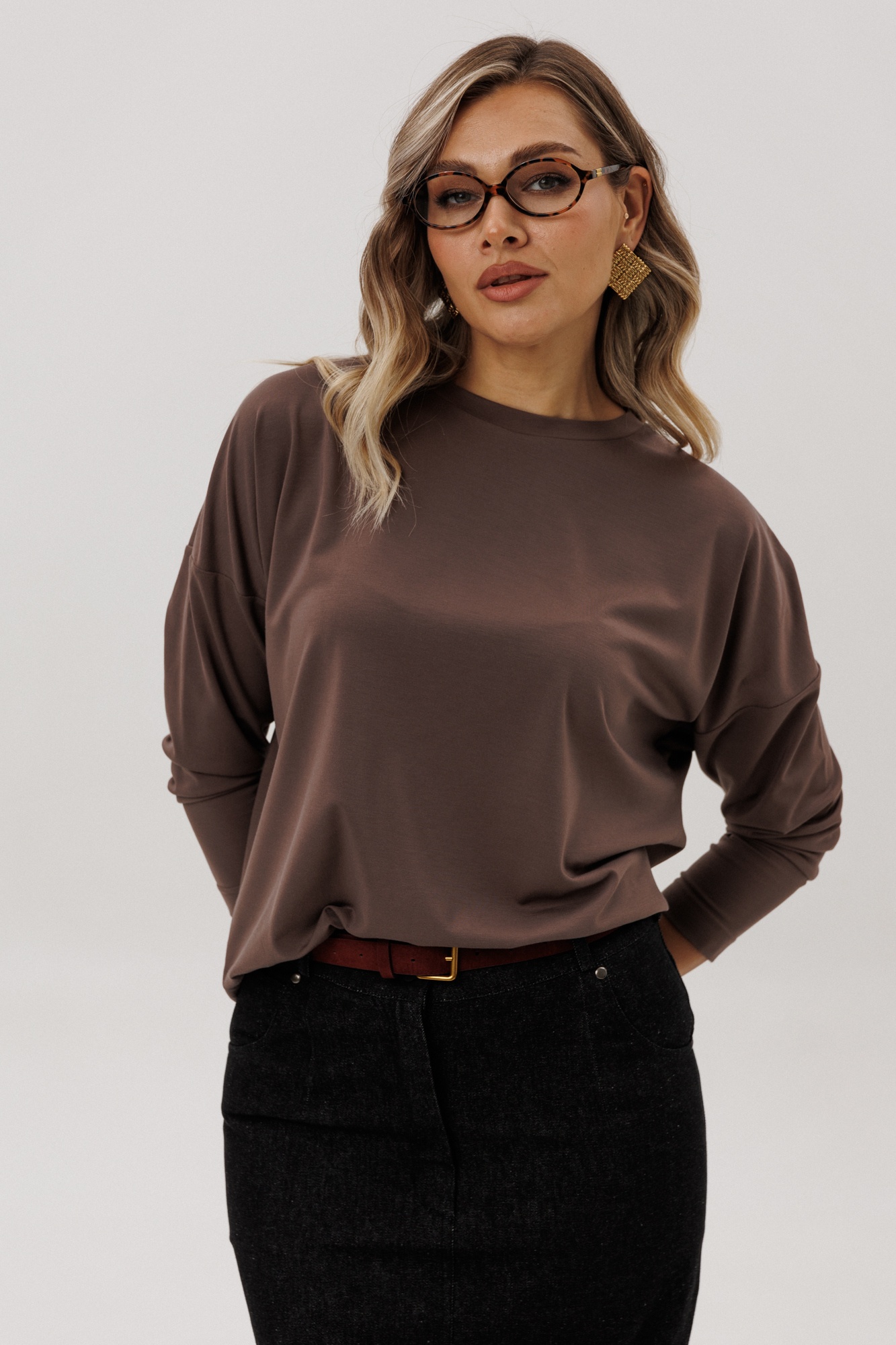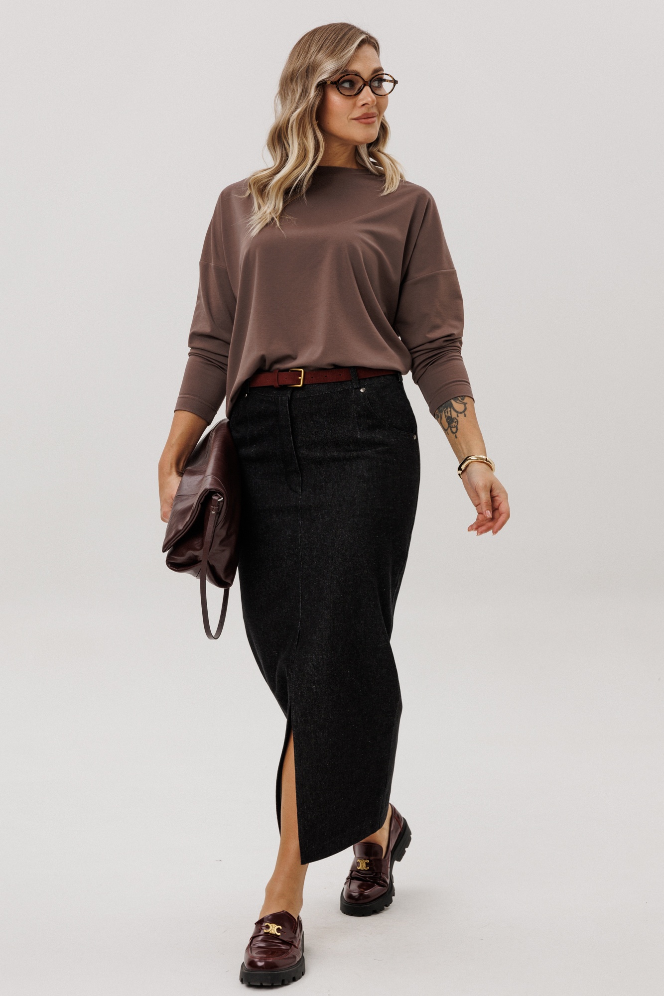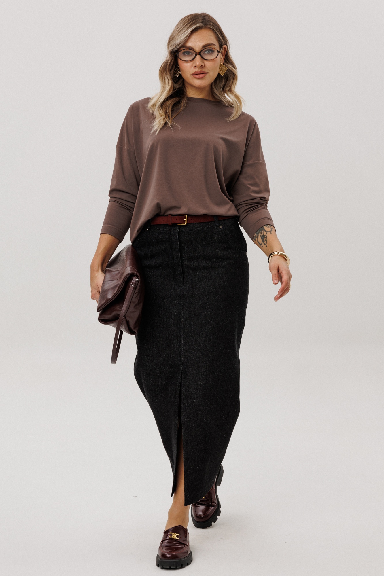 Элегантный двухпредметный комплект, идеальный для современного гардероба. Джемпер светло-коричневого цвета выполнен в свободном крое с длинными рукавами и широкой подгибкой по низу, что придает изделию аккуратный и завершенный вид. Дополняет ансамбль строгая черная юбка в джинсовом стиле, облегающего прямого силуэта, разработанная для придания фигуре выразительности. Центральная тесьма-молния на передней части юбки добавляет практичности, а умеренный разрез спереди обеспечивает свободу движений, подчеркивая динамичность образа. Этот стильный и утонченный костюм идеально подходит для офиса или повседневных мероприятий.