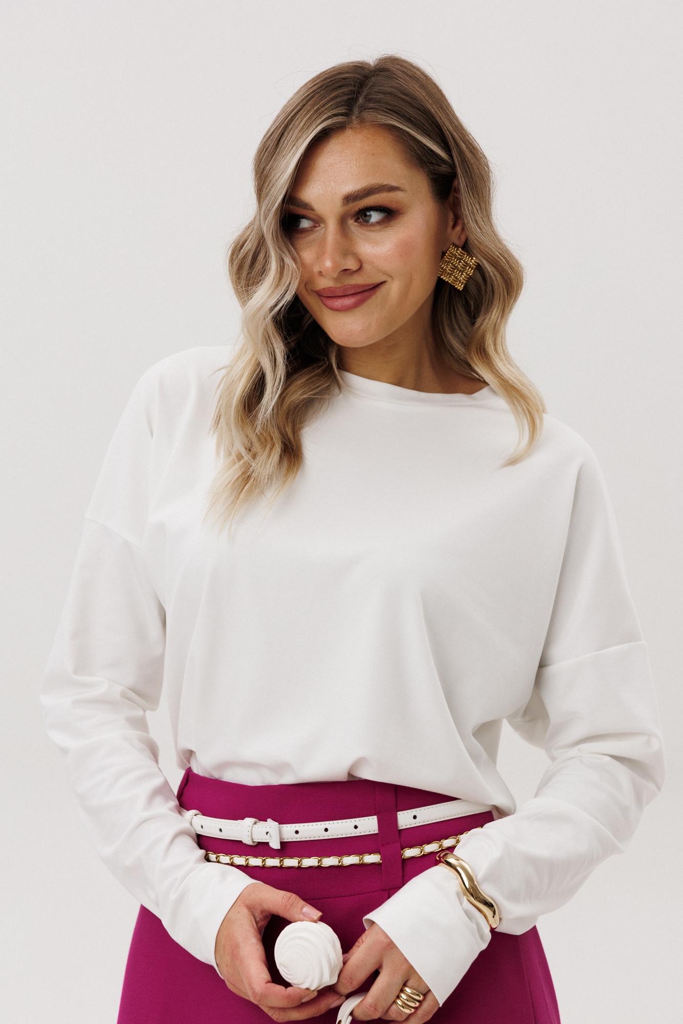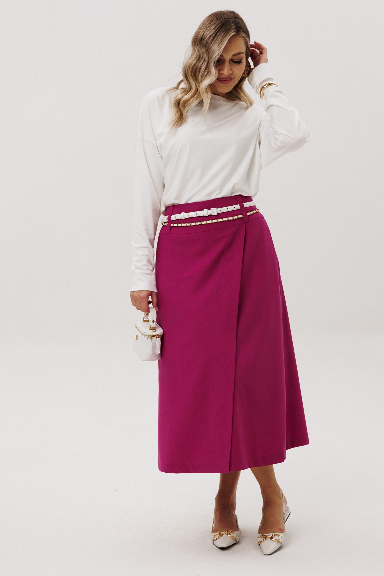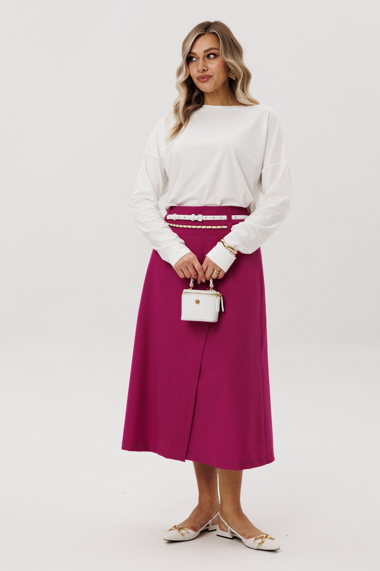 Комплект двухпредметный, состоит из джемпера и юбки. Джемпер свободного кроя с длинным рукавом. По низу широкая подгибка. Юбка из тонкои костюмной ткани на подкладке А-образного силуэта. Юбка по линии талии на широкой кокетке. По кокетке настрочены шлевки для декоративного ремешка. По передней половинке запах. В боковых швах карманы. Застежка по центру задней половиник на потайную тесьму-молнию.