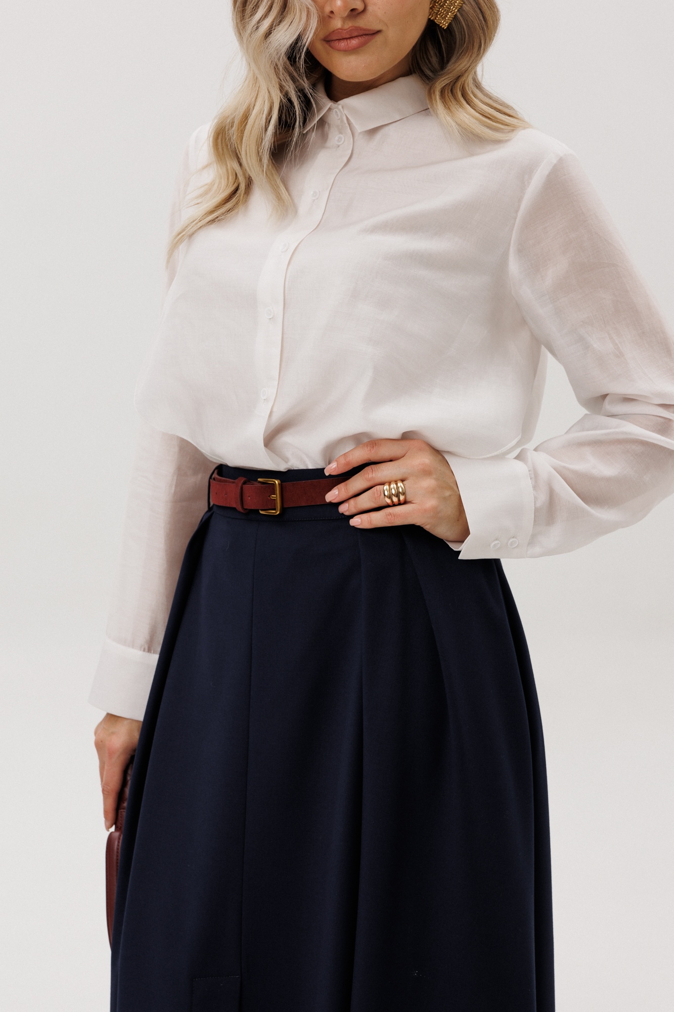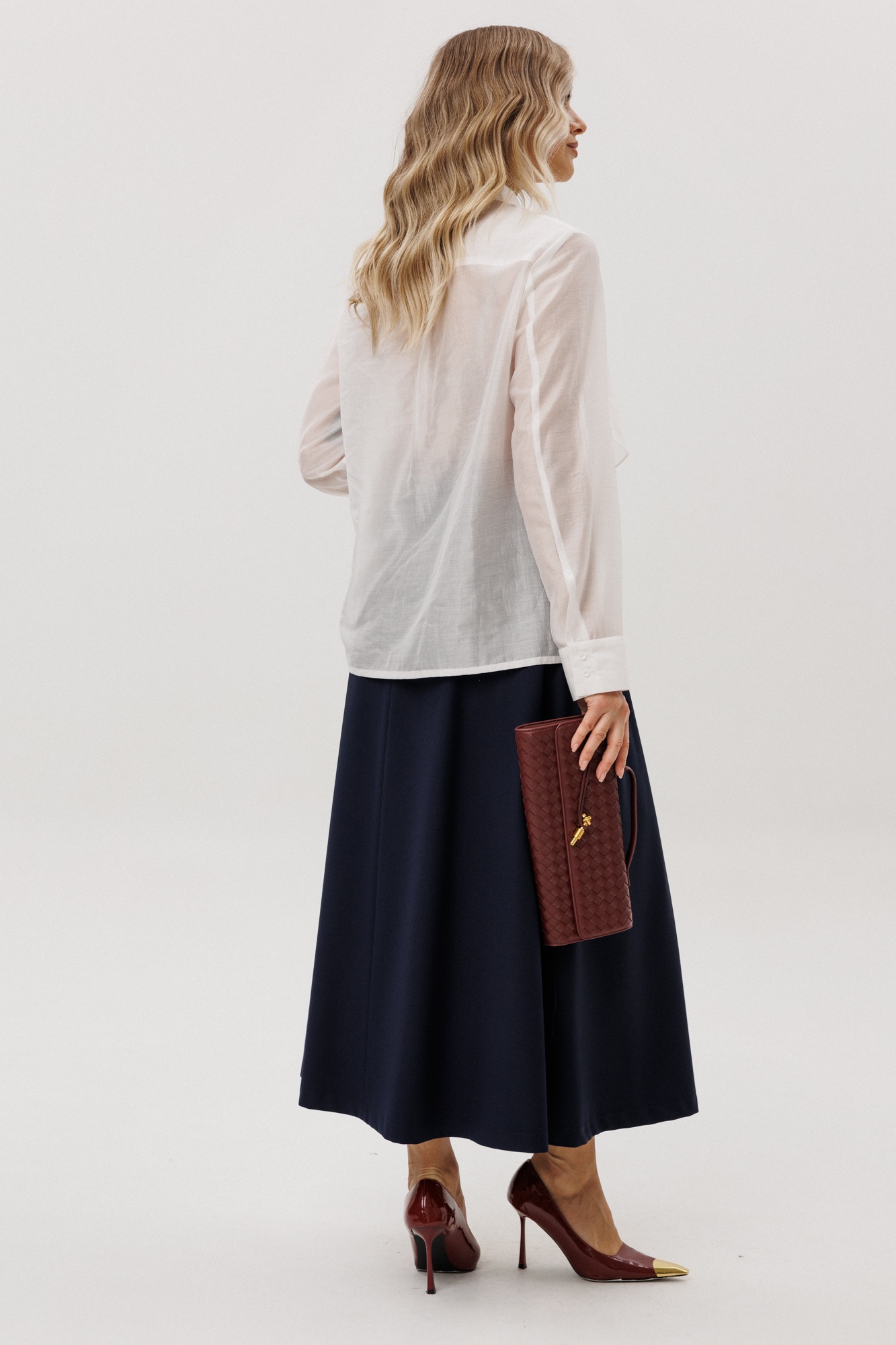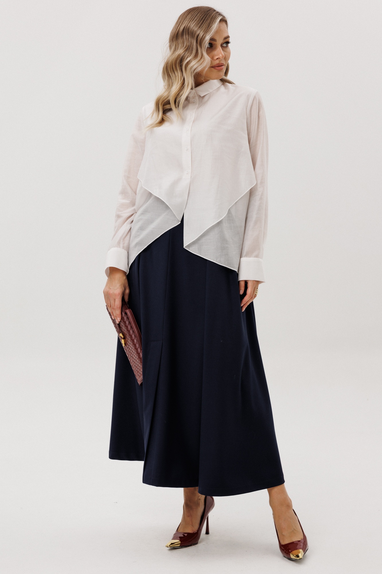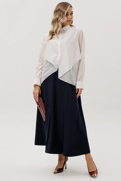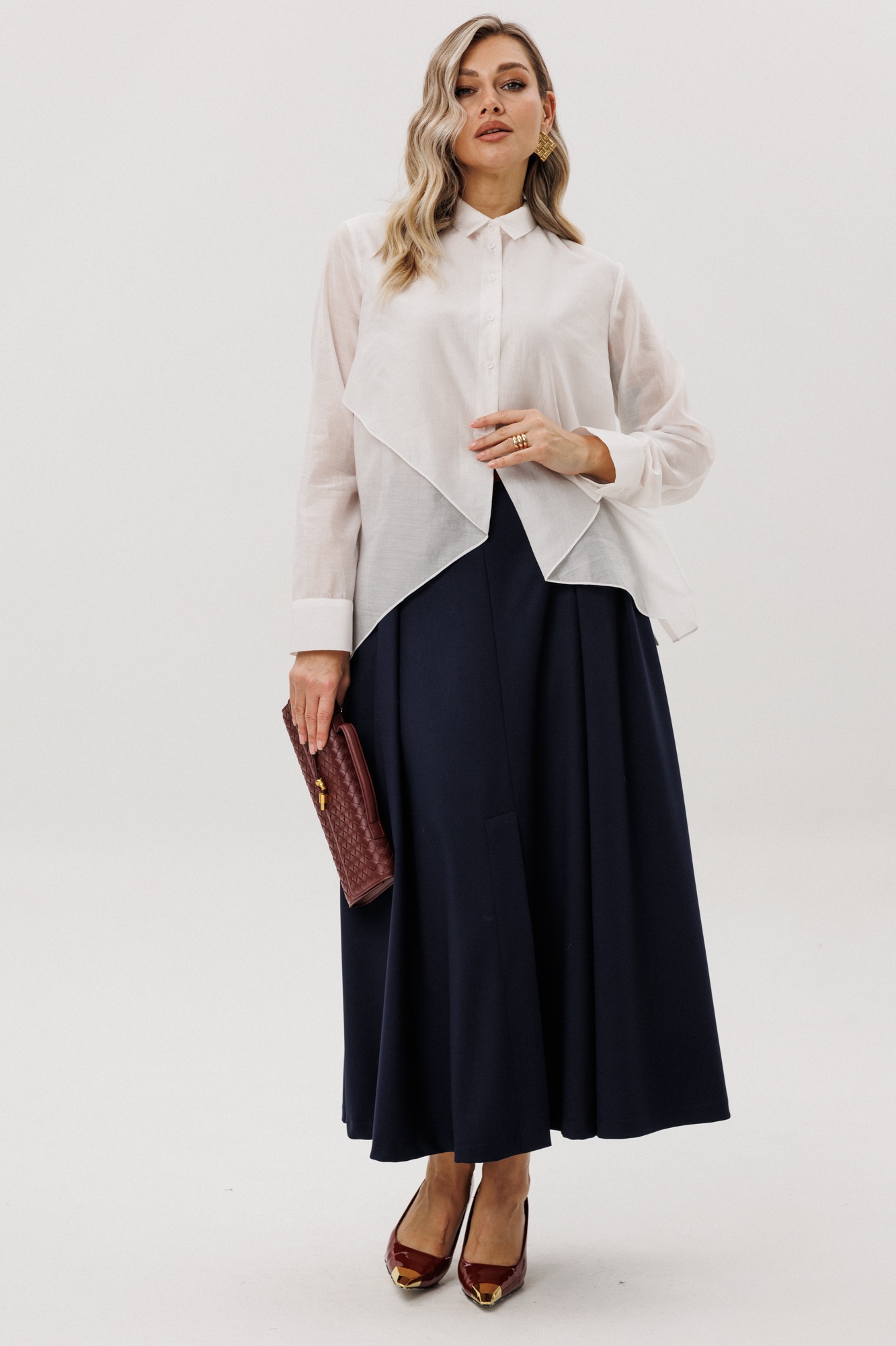 Комплект двухпредметный , сотоит из рубашки и юбки. Рубашка прямого силуэта с воротником на стойке и втачным рукавом с манжетами. Полочка двойная с ассиметричной линией низа. Юбка расклешенная на подкладке. По предней половинке по линии талии складки. По среднему шву передней половинки шлица. В боковых швах карманы. По среднему шву задней половинки по линии талии застежка на потайную тесьму-молнию.Ширина по линии талии регулируется резинкой