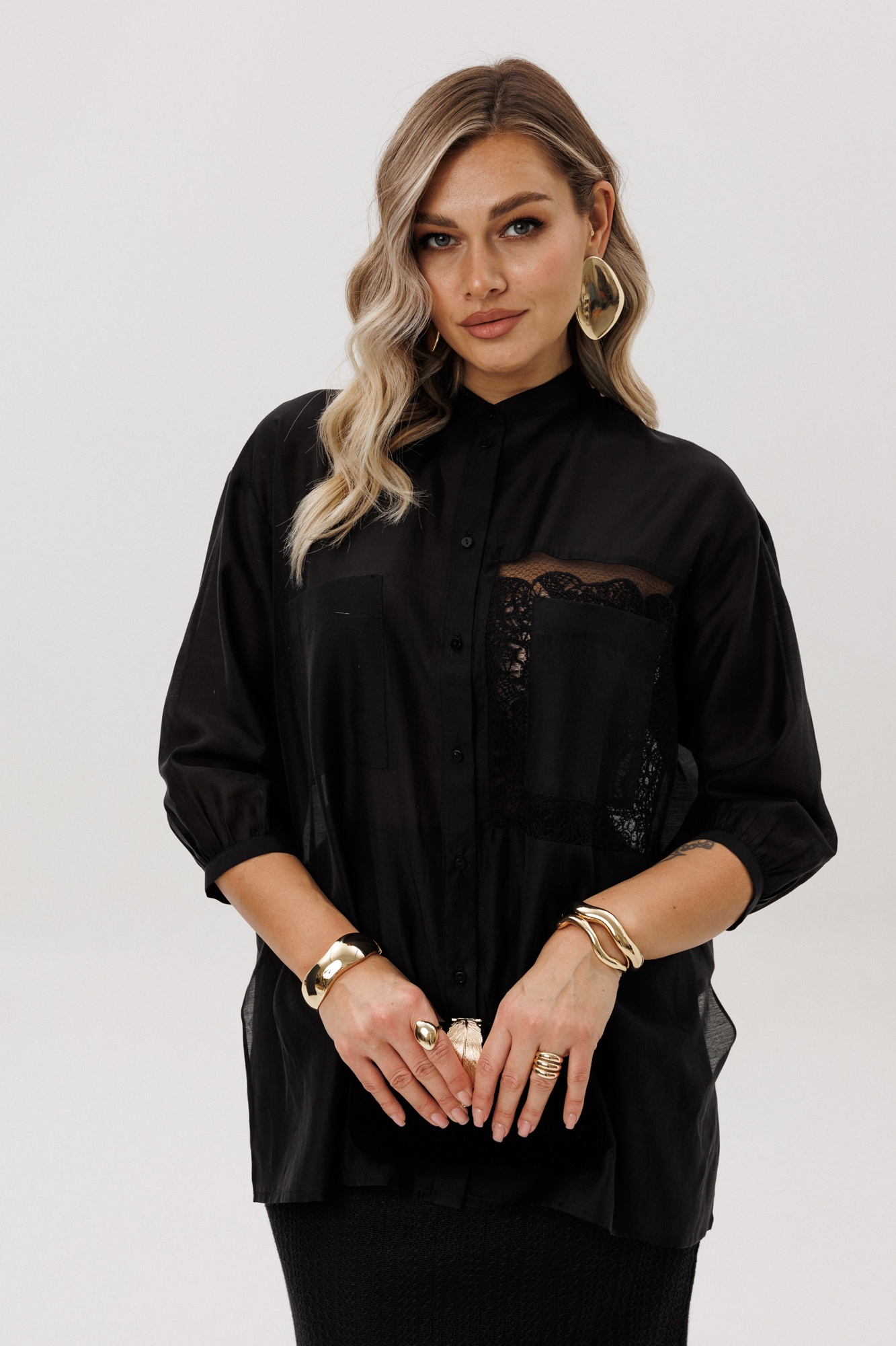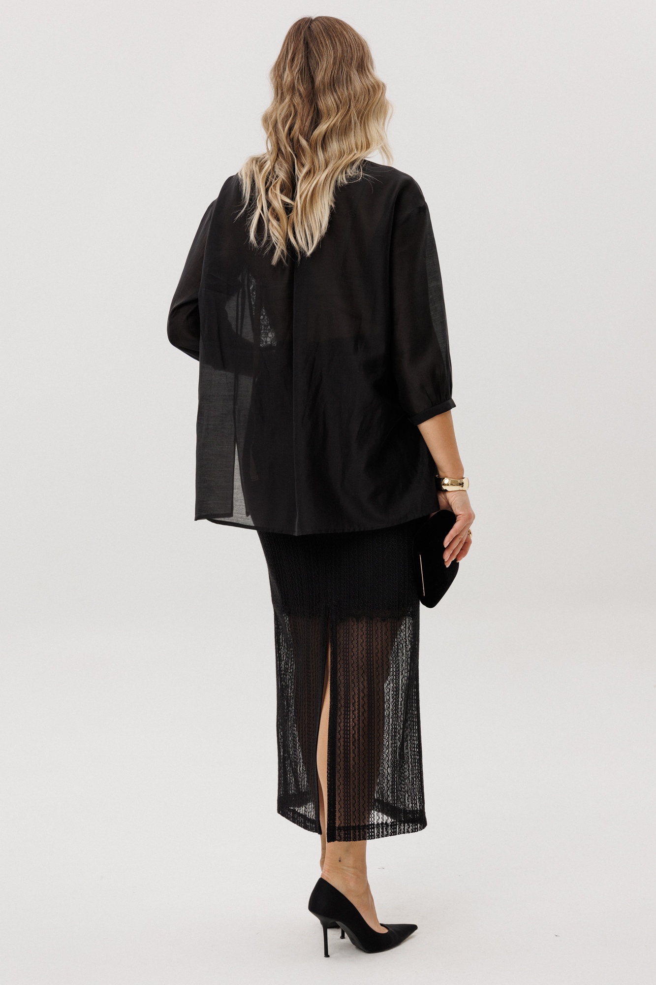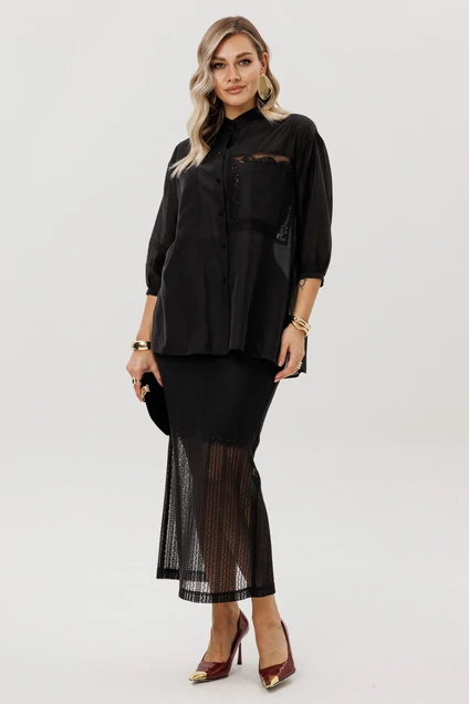 Комплект двухпредметный , состоит из блуза и юбки. Блуза свободного кроя со спущенным плечом, двумя накладными карманми на полочке. Карман на левой полочке настрочен на декоративную кружевную вставку. Рукав 3/4 с узкими манжетами . Воротник -стойка.Юбка прямого силуэта на трикотажной подкладке. По спинке по среднему шву разрез. Застежка на потайную молнию по спинке. В боковых швах карманы. Пояс регулируется резинкой