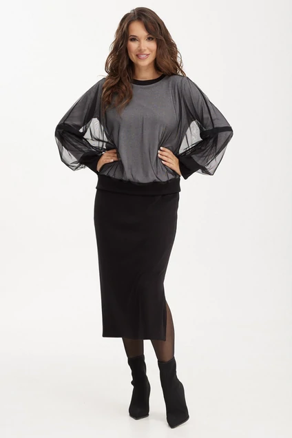 Элегантный комплект из джемпера и юбки миди. Выполнен из фактурного трикотажного полотна средней плотности(лапша). Отлично держит форму и скрывает недостатки. Джемпер свободного кроя с втачным рукавом. Горловина округлой формы с отделкой из основной ткани. Воздушный фатиновый эффект джемперу придает объемно наложенная текстильная сетка, закрепленная по горловине, в манжетах рукава, а так же по низу джемпера. Стыковочные швы обработаны декоративной тесьмой.Низ рукава и джемпера обработан довязом, выполненным из основной ткани. Юбка прямого кроя с притачным поясом, дополненным эластичной тесьмой. В боковом шве расположен разрез. Длина джемпера от плечевого шва 64см. Длина рукава 60см. Длина юбки 80см.