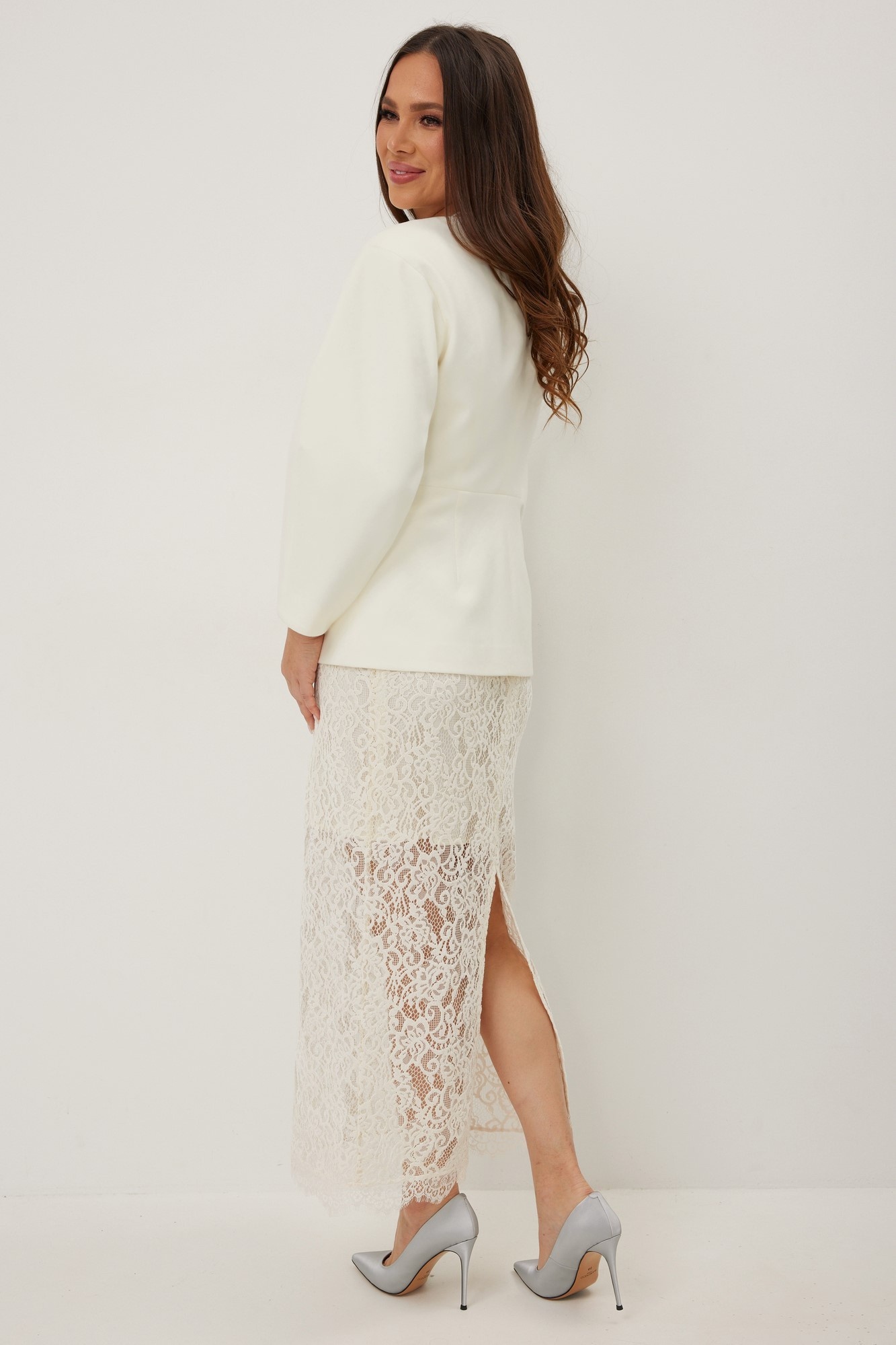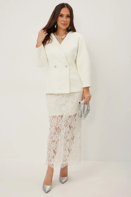 Элегантный и безумно красивый комплект из жакета и кружевной юбки. Жакет двубортный приталенного силуэта с оригинальными объемными стильными рукавами. Жакет выполнен из красивой костюмной ткани на подкладке. Застежка на красивые пуговицы и потайную кнопку. Юбка миди прямого классического кроя с притачным поясом, дополненным эластичной тесьмой. Выполнена из красивого бархатного кружева на подкладке. Длина жакета от плечевого шва 67 см. Длина рукава 60см. Длина юбки по боковому шву 88 см.