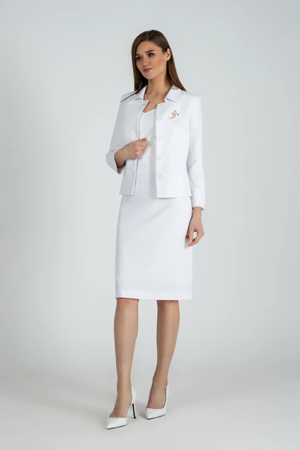 Комплект женский состоит из жакета и юбки. Жакет свободного силуэта на подкладке, воротник стойка-отложной, застёжка центральная бортовая на декоративные петли и пуговицы. Рукав втачной двухшовный, укороченный, с притачной манжетой по низу. Спинка со средним швом. Юбка классическая, зауженная к низу, на поясе. В центральном шве заднего полотнища – застёжка на потайную молнию, снизу разрез. Юбка на подкладке. Длина жакет 53-55 см. длина юбки 65-67 см.
