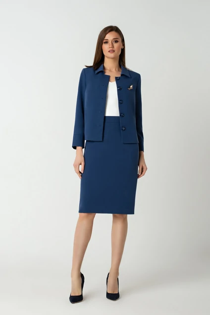 Комплект женский состоит из жакета и юбки. Жакет свободного силуэта на подкладке, воротник стойка-отложной, застёжка центральная бортовая на декоративные петли и пуговицы. Рукав втачной двухшовный, укороченный, с притачной манжетой по низу. Спинка со средним швом. Юбка классическая, зауженная к низу, на поясе. В центральном шве заднего полотнища – застёжка на потайную молнию, снизу разрез. Юбка на подкладке. Длина жакет 53-55 см. длина юбки 65-67 см.