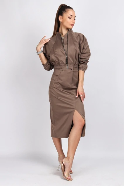 Костюм женский состоит из жакета(бомбера) и юбки.Жакет(бомбер) на подкладке с застёжкой на декоративную молнию.Рукав цельнокроеный с подрезами.По низу рукава и жакета(бомбера)резинка.По горловине воротник стойка. Длина жакета(бомбера) 44 см,длина рукава от начала горловины 67 см.Юбка зауженная к низу с фигурным разрезом.Застежка на тесьму молния .В боковых швах карманы с отрезным бочком.Длина юбки с поясом 74 см.Цвет:серо-коричневый.