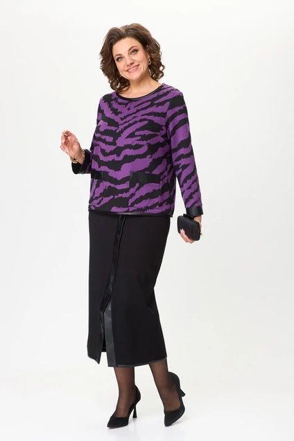 Костюм с юбкой 1394 фиолетовый принт + черный Michel Chic