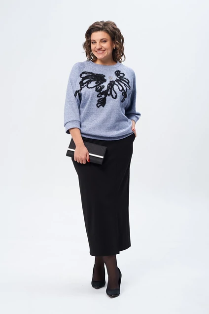 Универсальный и удобный женский юбочный комплект. Данный комплект отличный вариант как для повседневной носки, так и для торжеств. Изделие состоит из джемпера и длинной юбки. Джемпер свободного кроя выполнен из теплого трикотажа. По переду украшен вышивкой, благодаря чему изделие смотрится нарядно. Горловина круглая, рукав реглан "летучая мышь". Низ и рукава на манжете из основной ткани. Юбка выполнена из трикотажа в мелкий рубчик. Прямая удлиненная юбка, по переду с рельефом и разрезом по низу. Изделие на притачном поясе с резинкой и двумя функциональными карманами в боковых швах. Благодаря своей универсальности этот комплект займет важное место в вашем осенне-зимнем гардеробе. Длина джемпера по спинке 65 см (±1 см), длина рукава от горловины 62 см. Длина юбки по боковому шву 92 см. Изделие подойдёт на рост 170 см.