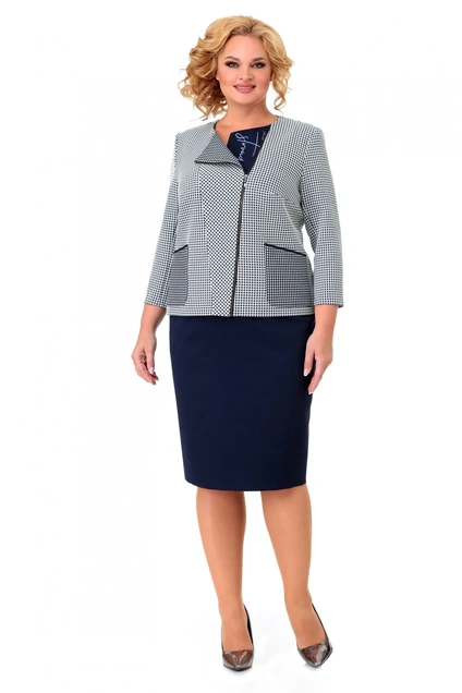 Костюм женский состоит из жакета и юбки. Жакет на подкладке по переду и ассиметричной застежкой на молнии с планкой декорированной печатью. По переду накладные карманы декоративной отделкой. Спинка со средним швом и талевыми вытачками. Рукава втачные двухшовные. Юбка на подкладке слегка зауженная к низу, по верху притачной пояс с резинкой по бокам и застежкой потайной молнией в среднем шве заднего полотнища. Длина жакета 57 см, длина рукава 50 см, длина юбки 67см.
