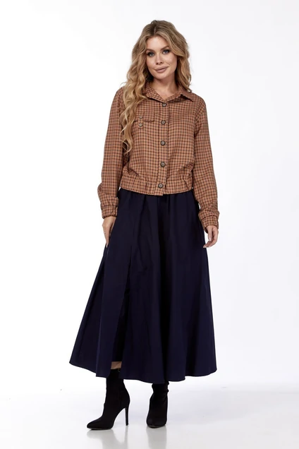 Костюм женский, состоящий из жакета и юбки-кюлот. Жакет прямого силуэта, на резинке. Рукав спущенный, на манжете с резинкой. По переду и спинке-кокетки.По правой части переда-декоративный клапан с патой. Воротник рубашечного типа, застёжка-планка с петлями-пуговицами.Юбка-кюлоты свободного силуэта. По поясу на резинке. В боковых шва-карманы. На юбке присутствуют разрезы. Длина по спинке-113см, длина рукава от горловины-67см. Длина юбки-кюлот-8см. Состав кюлот: хлопок-62%, нейлон-35%,спандекс-3%