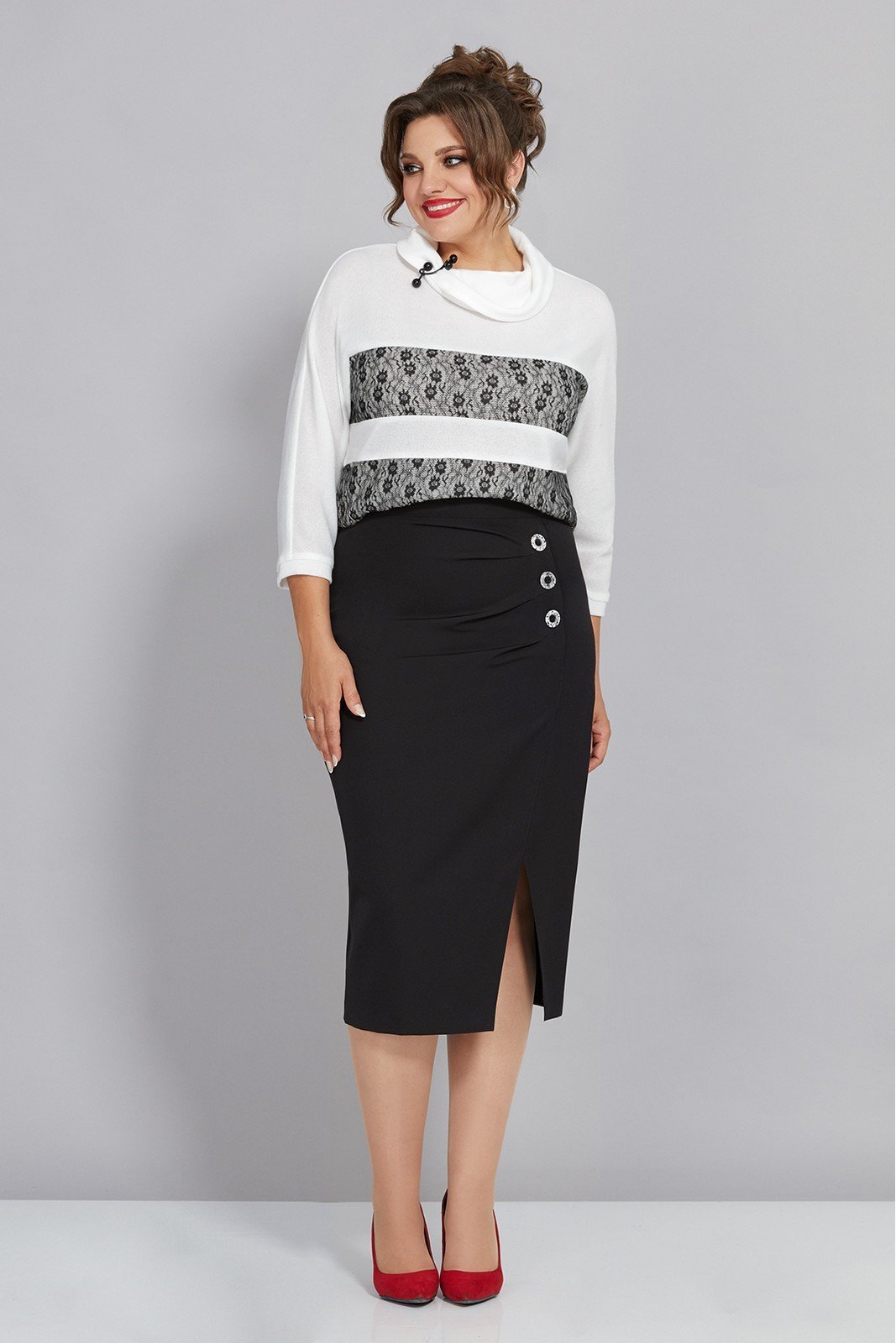 Женский комплект, состоит из блузы и юбки. Блуза свободного силуэта, выполнена из трикотажа однотонного и вязаного трикотажа с рисунком. Горловина платья обработана воротником-шалью, декорирован брошью, также на переднем полотнище выполнены вставки из трикотажа с рисунком. Рукав в блузе цельнокроеный, спинка идентична полочке, по боковым швам выполнены разрезы. Юбка из текстиля, верхний срез обработан притачным поясом, сзади на застежке на потайную молнию и пуговицу. По переднему полотнищу выполнен декоративный элемент с складками и пуговицами, по низу подреза разрез. Элегантный комплект хорошо подойдет для офиса, также блузу и юбку можно сочетать с другими вещами вашего гардероба. Блузка: Полиэстер 70%, Вискоза 27%, Эластан 3%. Длина юбки 72см, длина блузки 57см. Юбка 52р. Ширина талии -45см, Ширина бедер- 57см. Блузка: Ширина груди- 55см, Ширина талии -55см, Ширина бедер- 56см, длина рукава- 59см от воротника, ширина рукава 20,5см.