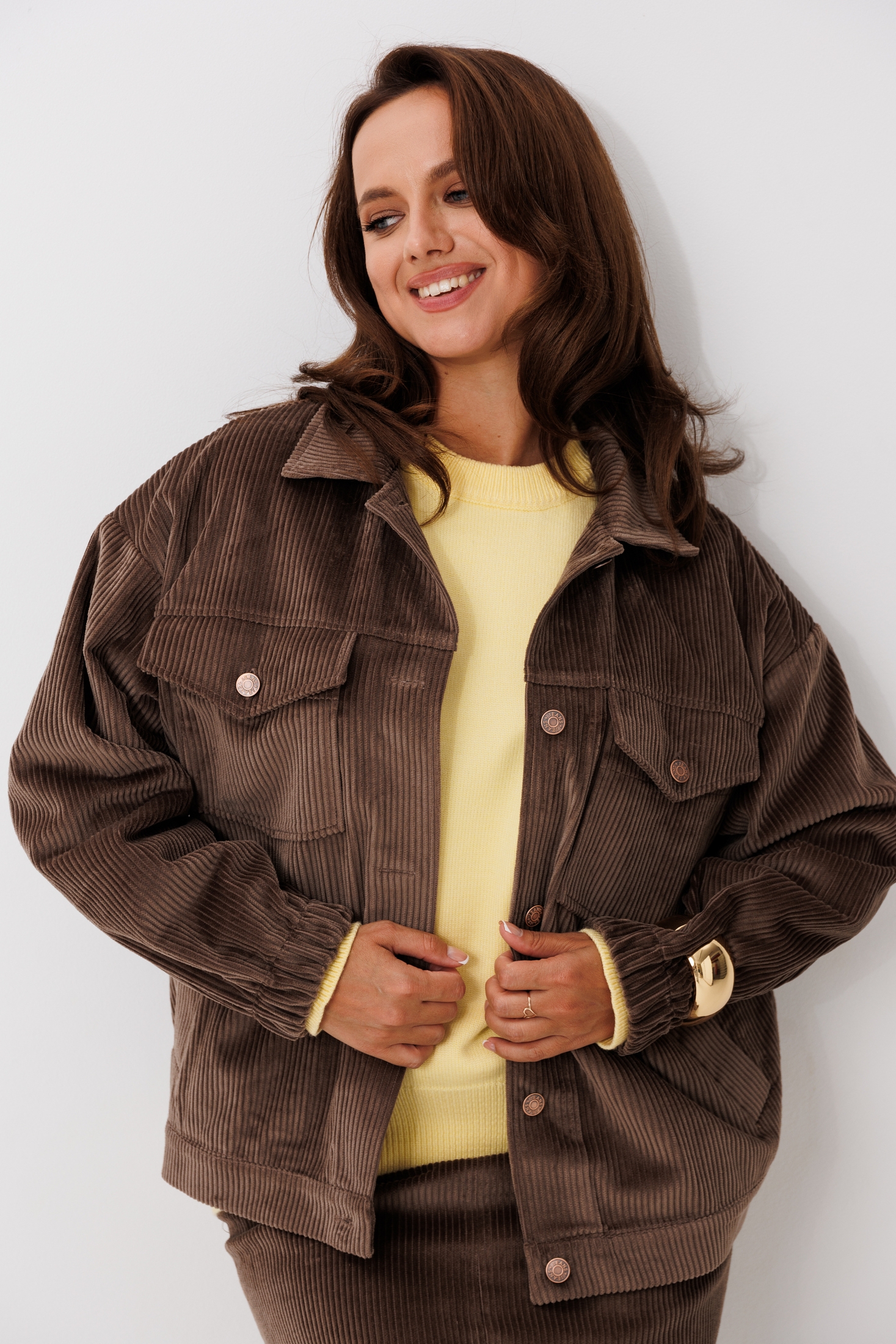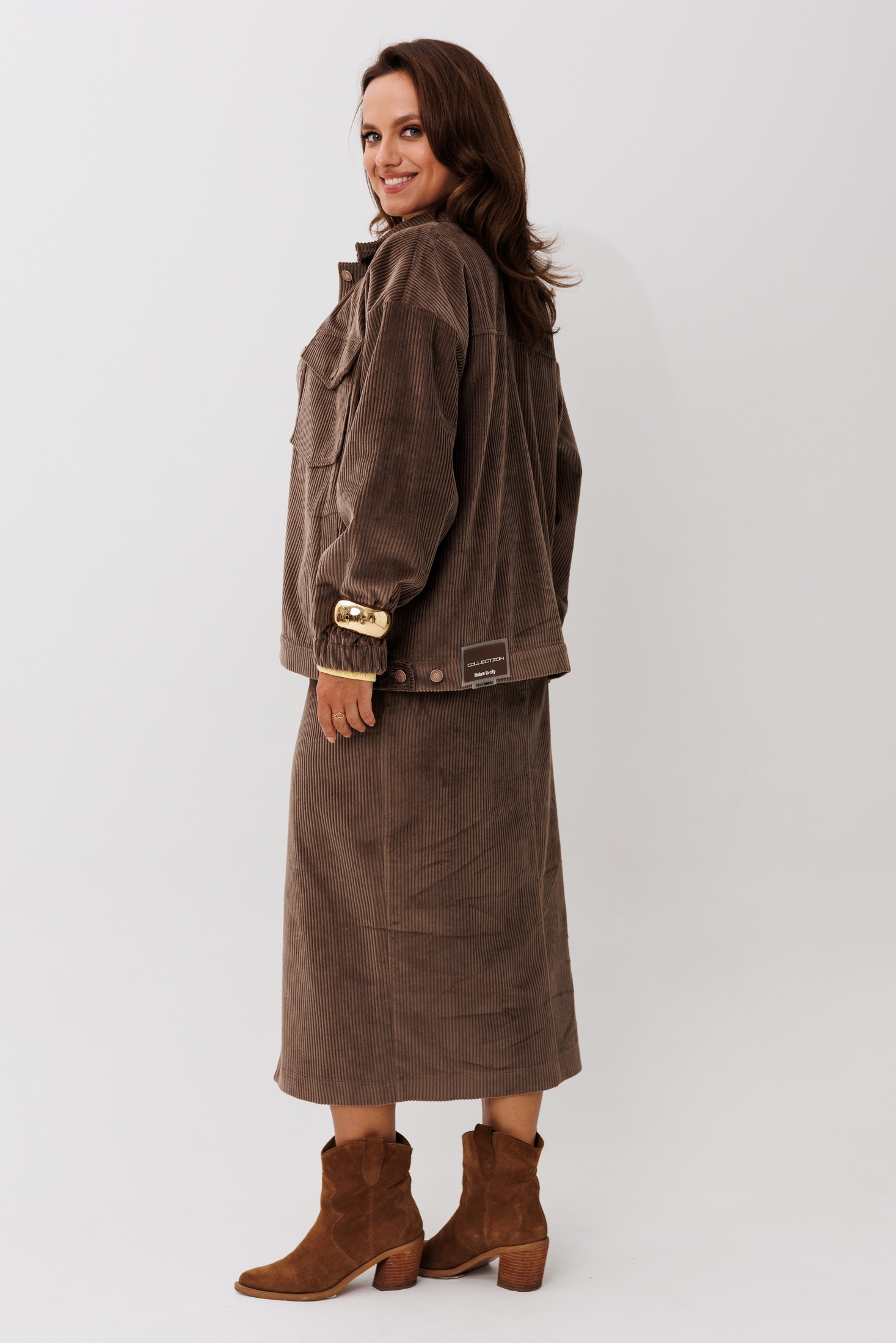 Комплект женский свободного силуэта состоит из бомбера и юбки. Бомбер со спущенными плечами застёгивается на прорезные петли и пуговицы. По переду прорезные карманы с широкой листочкой и накладные карманы с фигурными клапанами на застёжке. Воротник отложной. Рукава одношовные втачные на манжете. Юбка женская слегка зауженная к низу на притачном поясе со шлёвками, который застёгивается на прорезную петлю и пуговицу. По переду застёжка на молнию с гульфиком и откоском и карманы. По спинке центральный шов, заканчивающийся разрезом, кокетка и накладные карманы. Юбка и бомбер без подкладки.