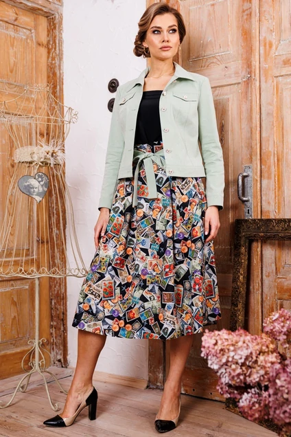 Комплект женский, состоящий из двух предметов : куртки в джинсовом стиле и юбки. Куртка полуприлегающего силуэта. Полочка с отрезной кокеткой, рельефными швами от кокетки до низа куртки. Спинка с отрезной кокеткой и рельефными швами. По низу куртки идет притачная планка, которая на боковых швах украшена настрочными патами. Рукав втачной, двухшовный. Воротник притачной. Застежка центральная на металлические пробивные пуговицы. Подборт нижней планки, нижний манжет выполнен из однотонного отделочного материала. Рельефы кокетки, клапаны и воротник отстрочены двойной отделочной строчкой. Юбка силуэта "колокол" с завышенной линией талии. По верхнему краю юбки, который обработан подкройной обтачкой, заложены встречные складки. В боковых швах юбки - карманы. На уровне складок по линии талии настрочены шлевки. Декором юбки является объемный пояс, который украшен металлическими деталями.