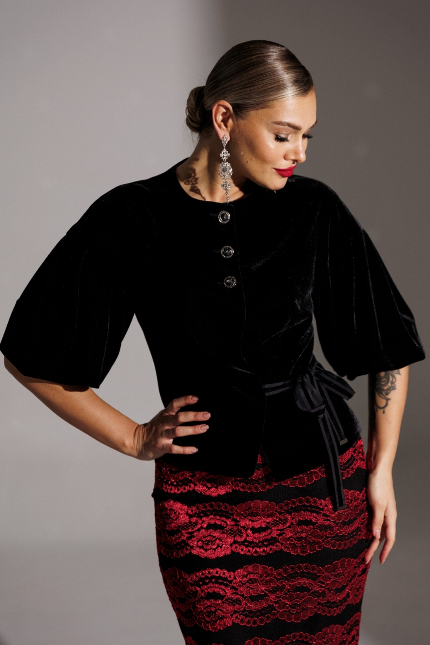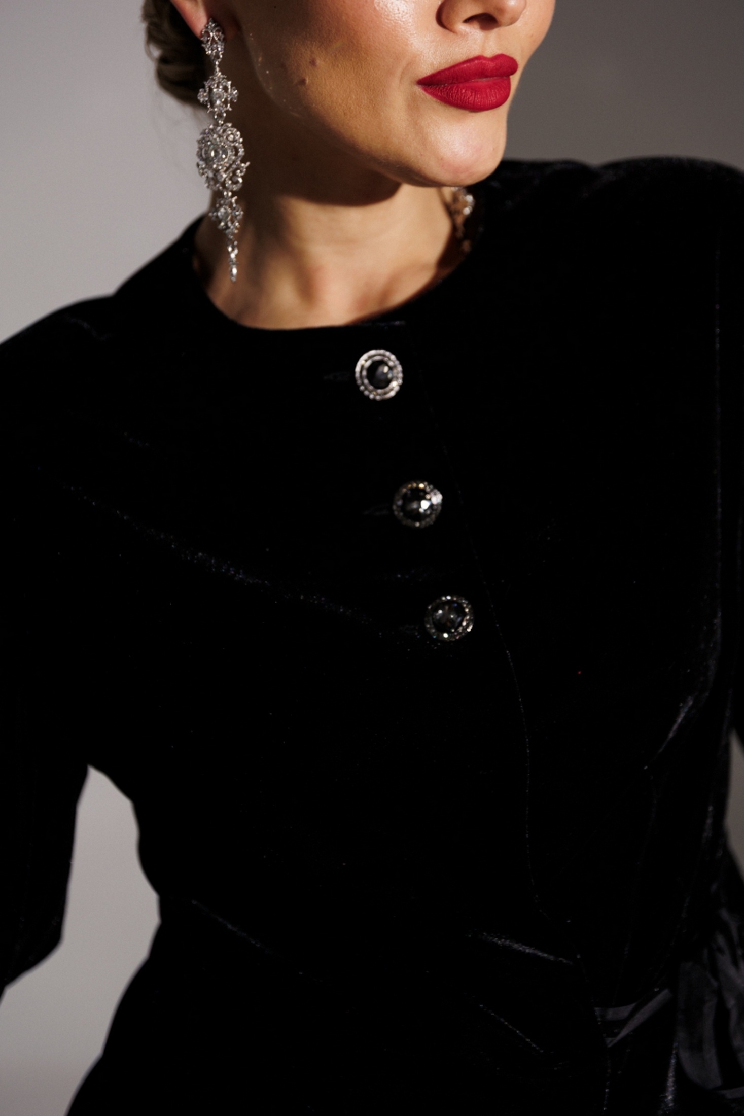 Нарядный комплект, состоящий из жакета и юбки. Комфортный жакет из велюра полуприлегающего силуэта с центральной комбинированной застежкой на 3 пуговицы и 3 потайные кнопки. Спинка со средним швом и талиевыми вытачками. По переду также талиевые вытачки. Горловина округлой формы. Объемные фантазийные рукава со складками смягчают строгий силуэт. Декором выступают декоративные пуговицы и завязка на талии. Шикарная юбка из сетки с серебряным напылением заужена к низу. Молния и шлица в среднем шве. По талии кокетки. Костюм на подкладке. длина спинки жакета: 54 см длина юбки: 65 см длина рукава от горловины: 55 см