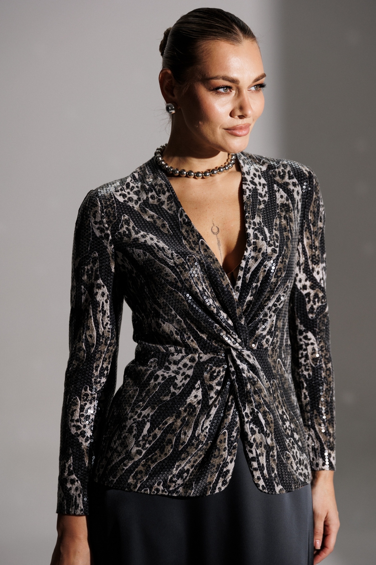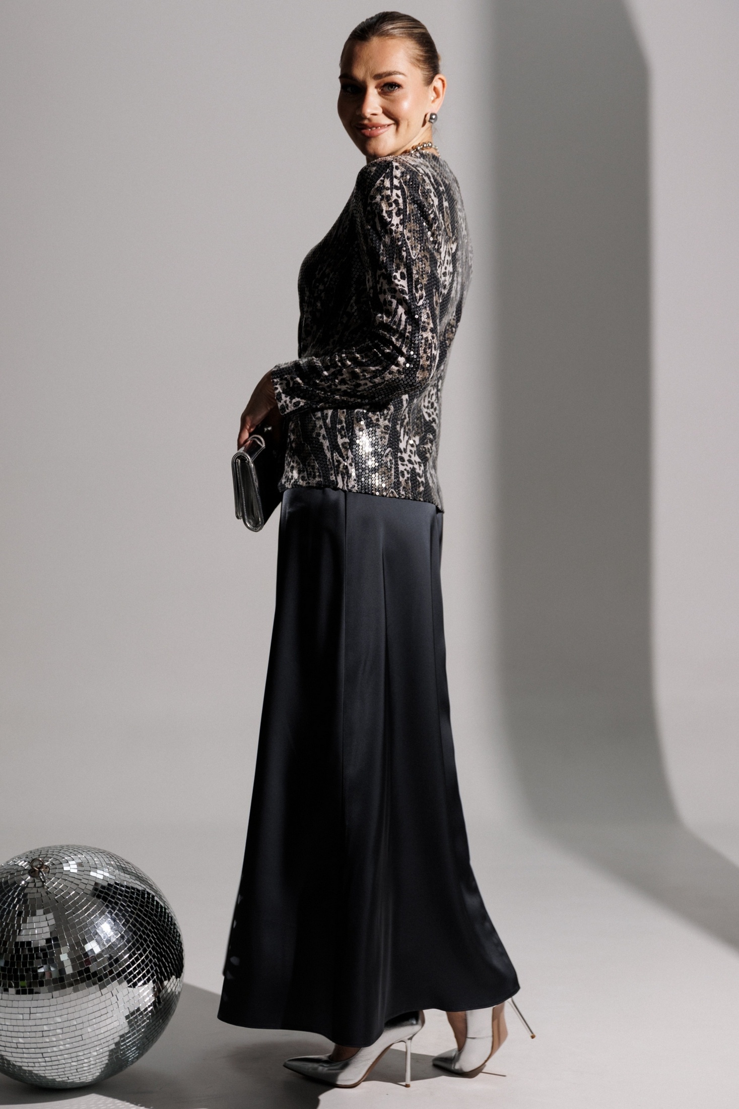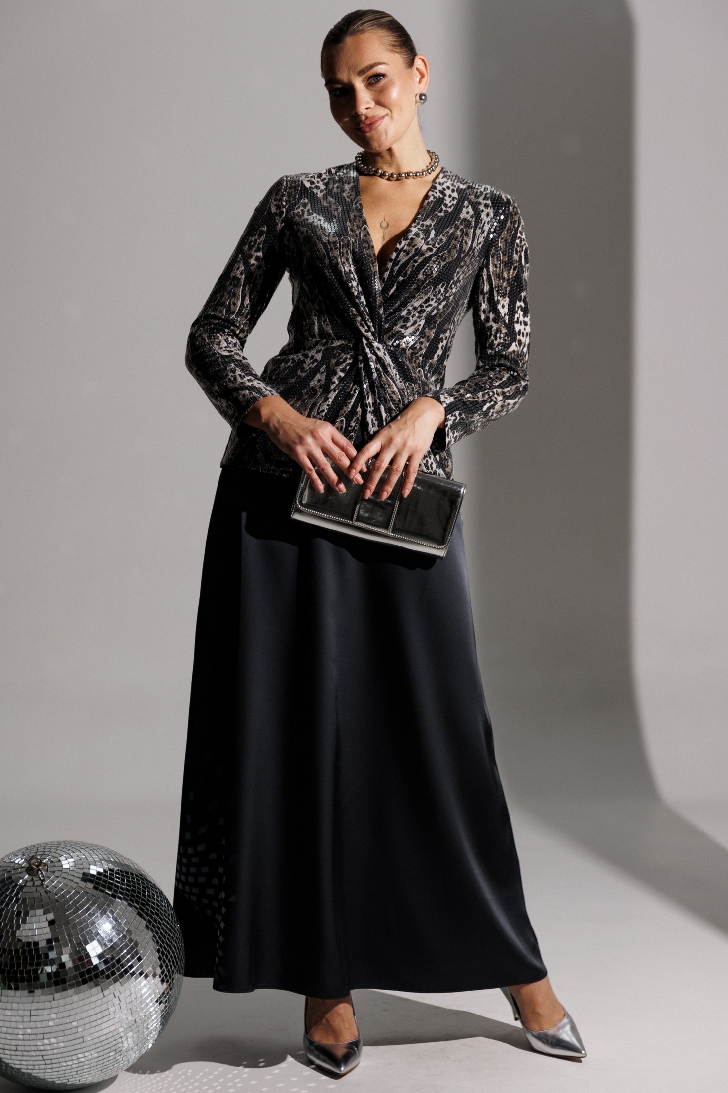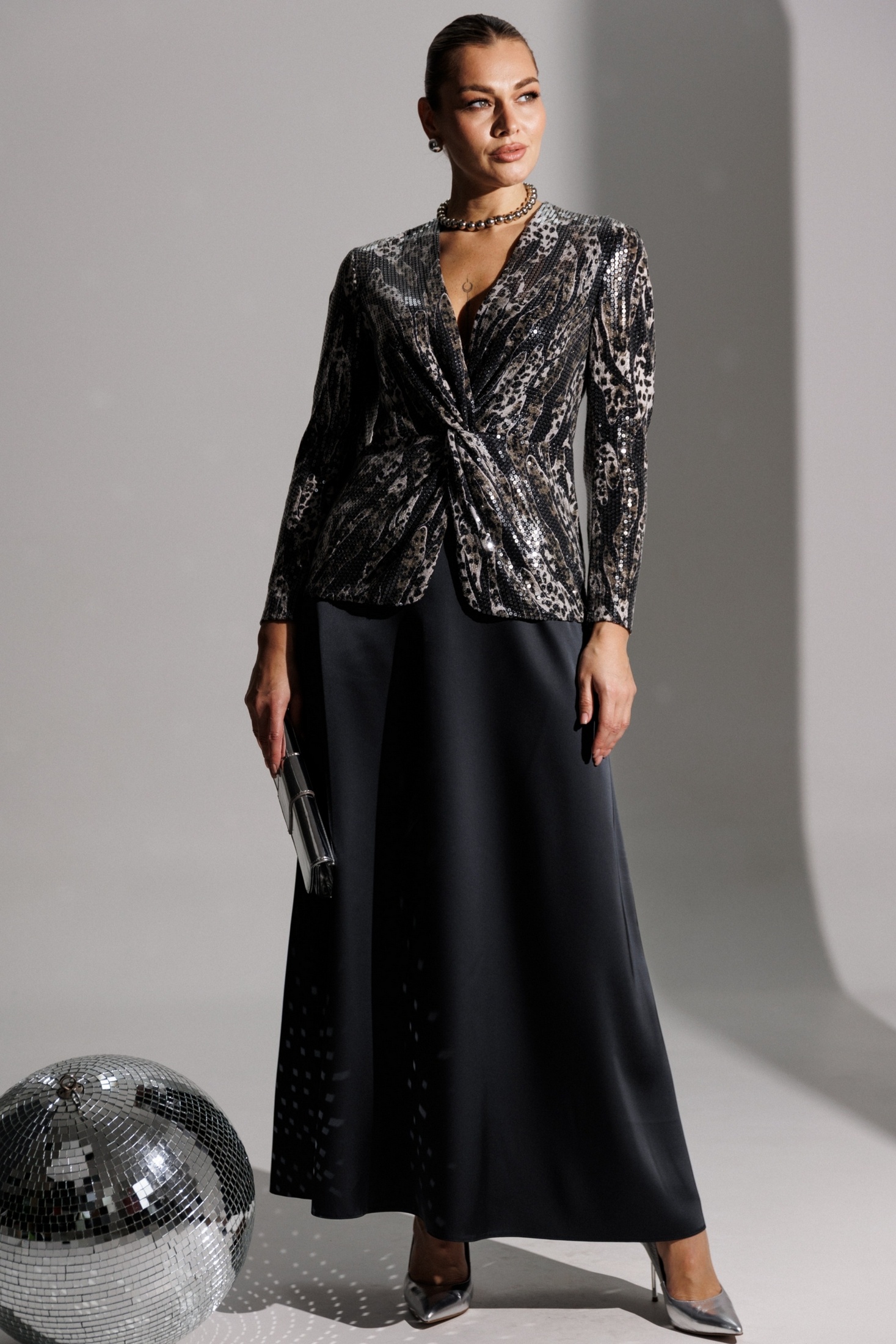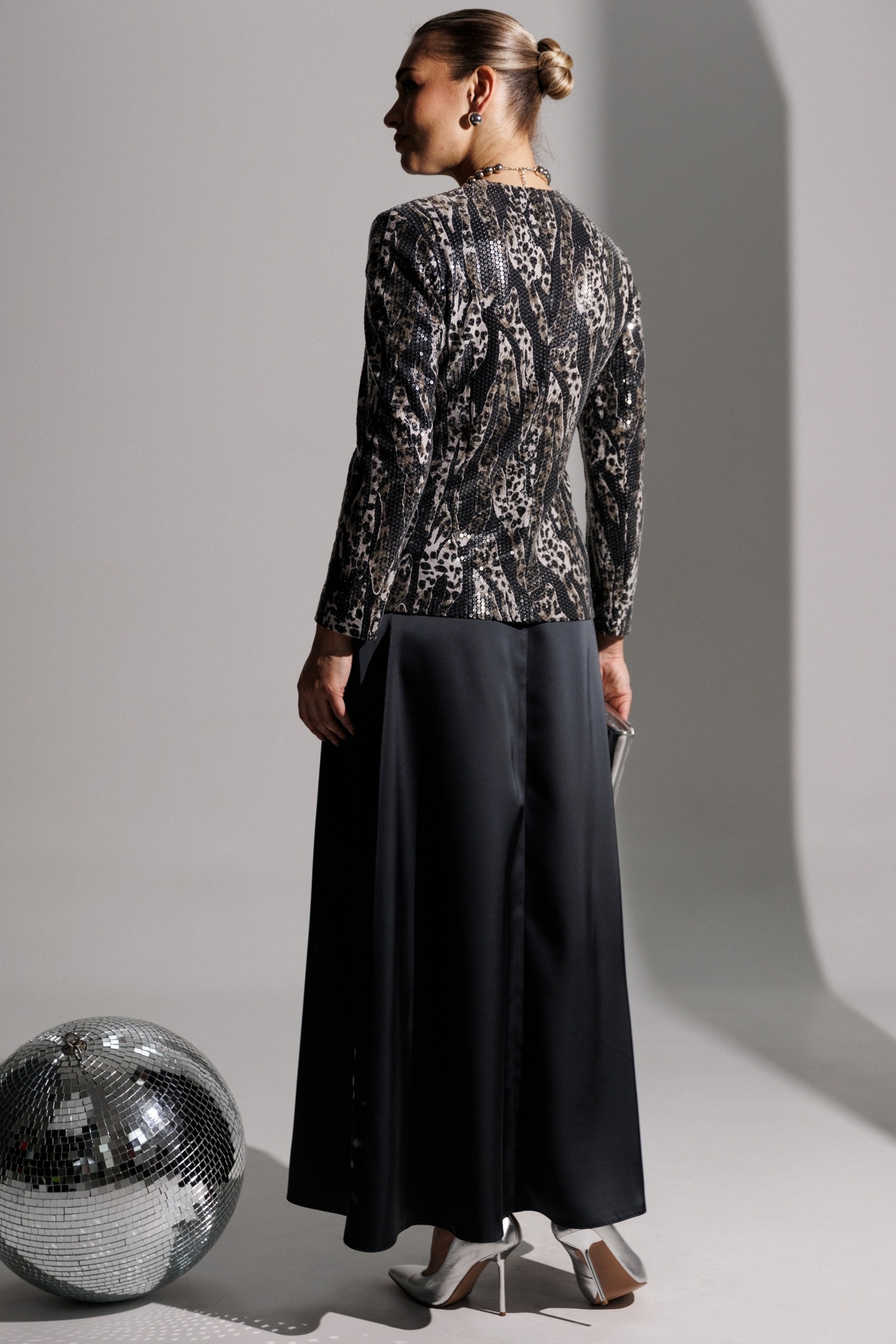 Продолжением нашей нарядной коллекции является роскошный комплект, состоящий из блузы, имитирующей жакет, и невероятной струящейся юбки из атласа длины макси. Блуза из ткани в пайетки с декоративным узлом в области талии. V-образный вырез. Блуза приталенного силуэта с втачными, двухшовными рукавами. Блуза частично на подкладке. Юбка на поясе с резинкой. длина спинки блузона: 62 см