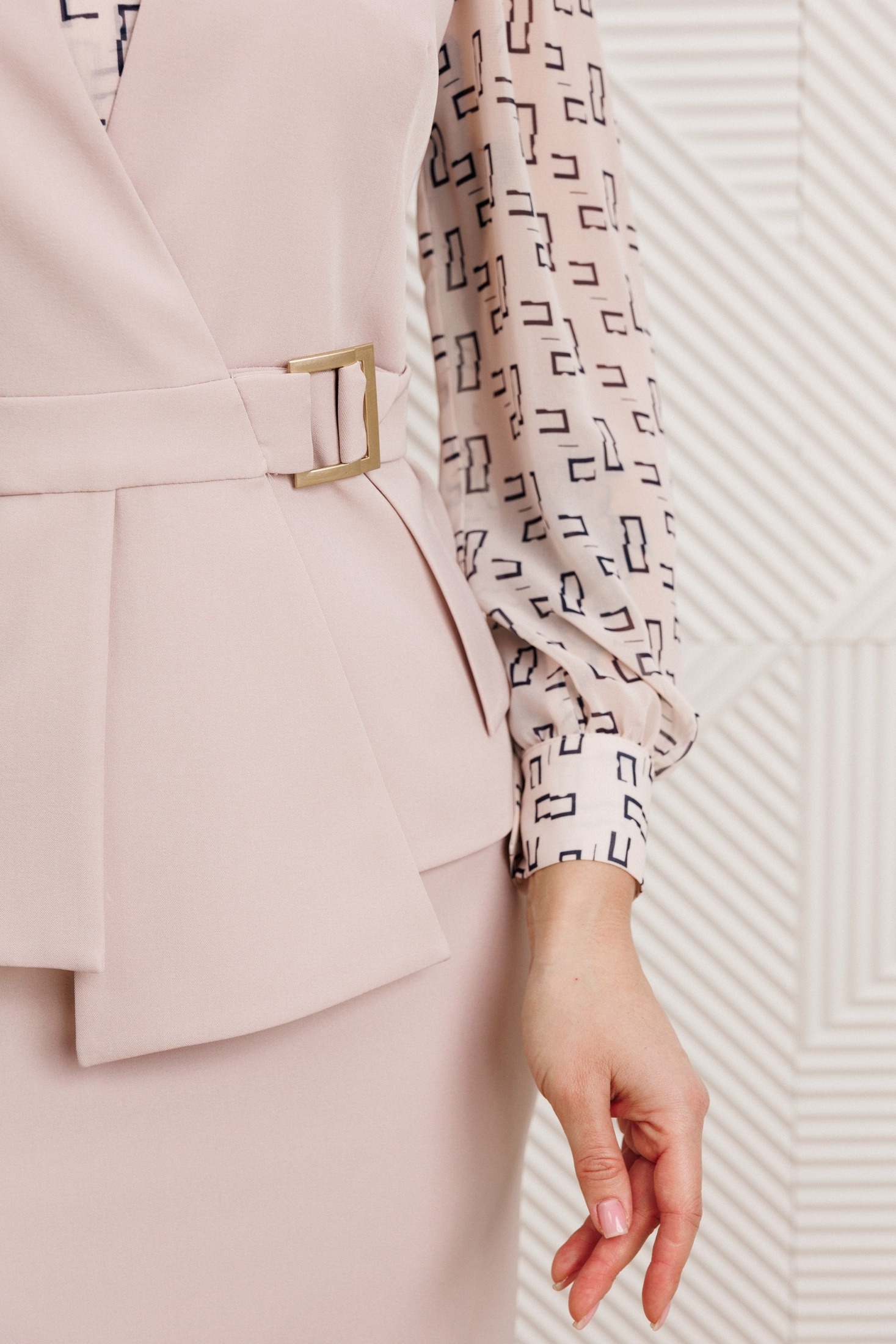 Блузка полуприлегающего силуэта. По переду нагрудные вытачки, спинка - с талиевыми вытачками. Воротник-стойка с рюшей по краю и завязкой. Рукав втачной, одношовный, по низу с манжетой. Жилет приталенного силуэта. Перед жилета отрезной по талии, с асимметричной фигурной баской. По верхней части переда по две талиевых вытачки. Спинка со средним швом и талиевыми вытачками. Застежка в виде пояса через пряжку-полукольца. Жилет на подкладке. Юбка зауженная к низу, с застежкой и шлицей в среднем шве. Юбка на притачном поясе, на подкладке. Элегантный комплект безупречно сидит на фигуре и смотрится очень современно, а регулируемый пояс поможет усилить акцент на талии. длина жилета: 62,5 см, длина юбки: 65,5 см