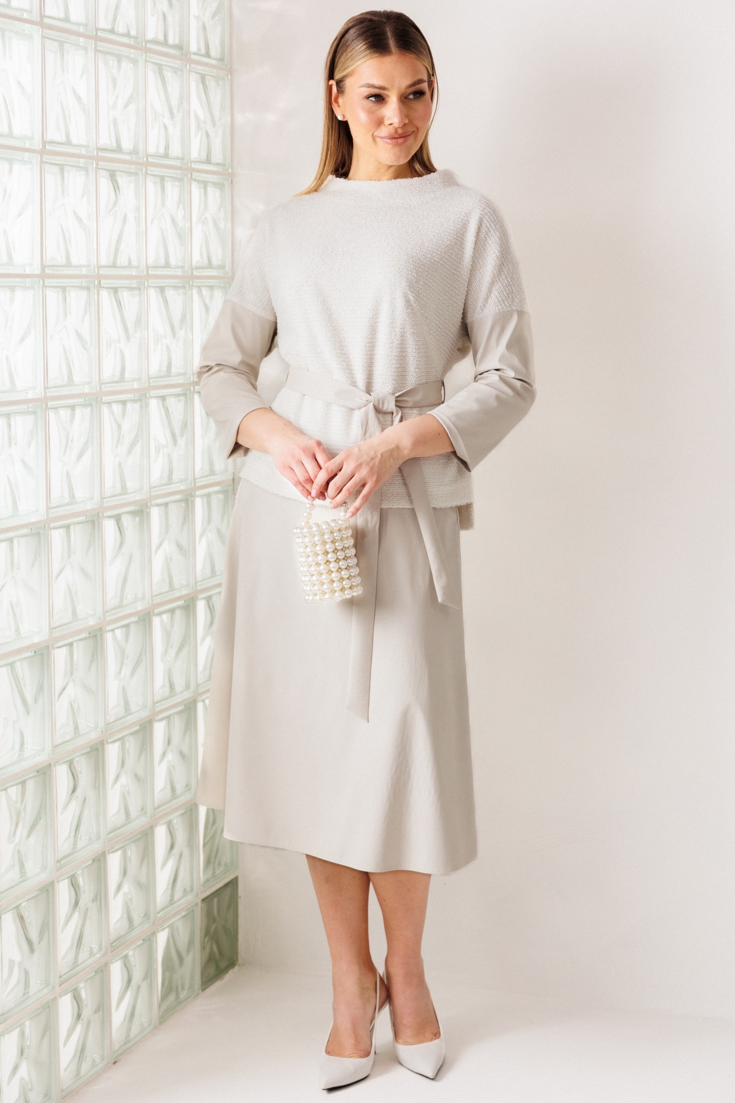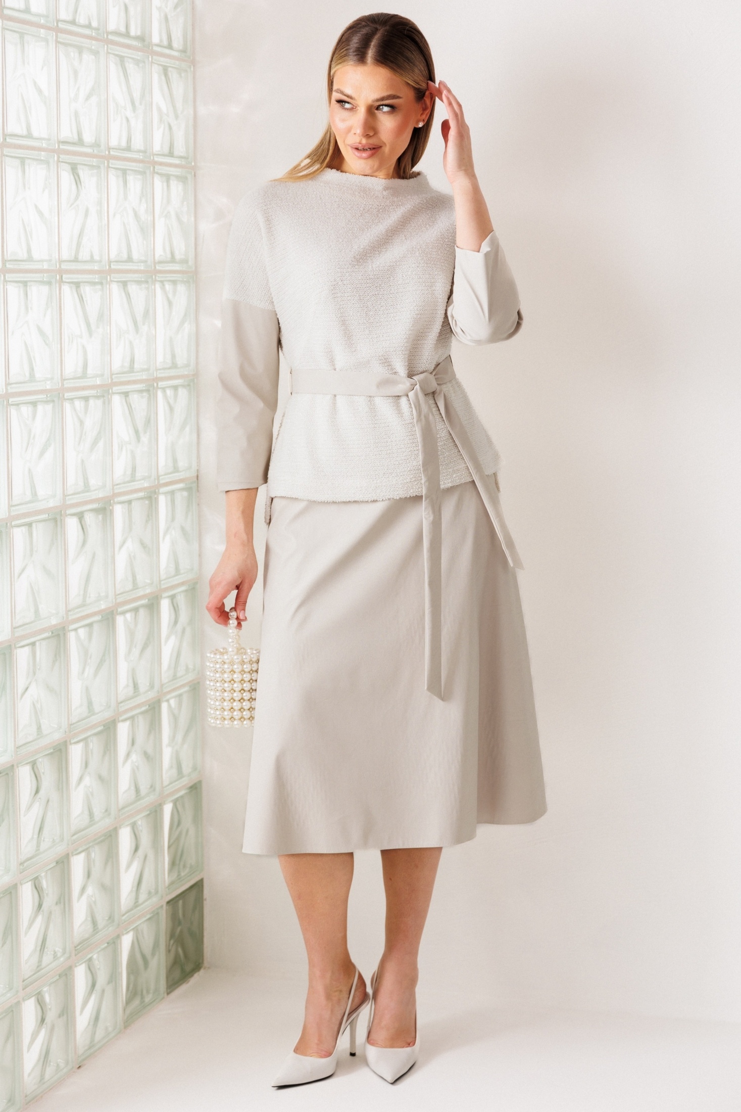 Костюм с юбкой 26-2718 белый Мода-Юрс — идеальное решение для вашего гардероба. Коллекция бренда Мода-Юрс впечатляет своим сочетанием элегантности и комфорта. Блузон из эластичного полотна с воротником-стойкой и нагрудными вытачками по бокам создает неповторимый образ. Юбка А-силуэта выполнена из костюмной ткани с притачным поясом и резинкой сзади, что гарантирует удобство и легкость в движении. Застежка на молнию в боковом шве предает практичность. Комплект оформлен поясом для акцента на талии. Блузон и юбка на подкладке. Универсальный белый цвет костюма дополнит любой утонченный образ, подходящий для офисного или делового стиля. Длина спинки жакета составляет 59 см, а юбки — 78 см, что подчеркивает стильность и современность модели.