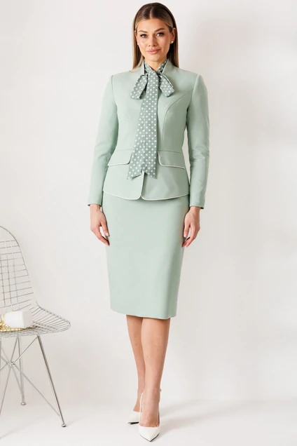 Костюм с юбкой 26-2808 ментол Мода-Юрс - отличный выбор для стильных деловых встреч. Коллекция бренда Мода-Юрс предлагает трехпредметный костюм, который включает приталенный жакет, прямую юбку и элегантную блузу. Выполненный из тканей с добавлением полиэстера и вискозы, костюм отличается комфортом и долговечностью, сохраняет форму и цвет. Жакет с рельефами, воротником-стойкой и карманами с клапанами подчеркивает силуэт. Блуза с бантом и разрезами на боках добавляет изюминку. Юбка на притачном поясе имеет застежку на молнию и шлицу для удобства. Костюм идеально подходит для осени и весны, благодаря стильному ментоловому цвету и длине юбки в 70 см и жакета в 59 см, длина рукава: 61 см
