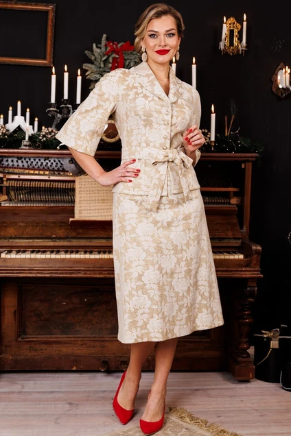 Бестселлер нашей коллекции - двухпредметный костюм, состоящий из жакета и юбки. Акцентом данного комплекта является съемный пояс. Для создания данного образа мы использовали однотонный материал с рисунком. Жакет прилегающего силуэта, с отрезной баской по переду и спинка с рельефами. Рукав-реглан. Юбка А-силуэта на притачном поясе, сзади с резинкой. Застежка на тесьму-молнию в боковом шве. Костюм на подкладке. Длина спинки жакета: 60 см длина юбки: 75 см длина рукава: 53,5 см
