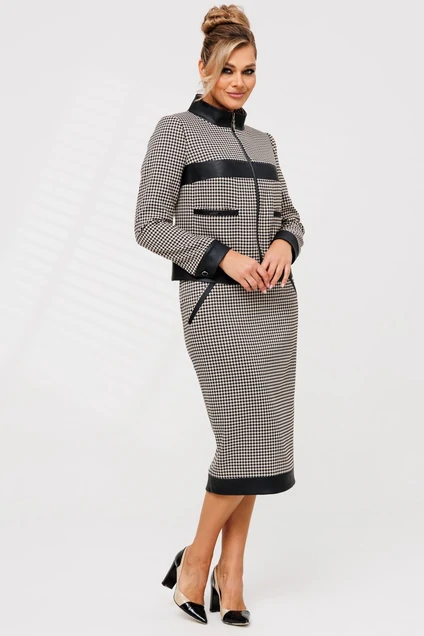 Костюм женский, состоящий из жакета и юбки. Жакет полуприлегающего силуэта с центральной застежкой на молнию. Спинка со средним швом. По переду горизонтальные вставки из эко-кожи. Карманы с листочкой также из отделки. По низу жакета планка. Воротник-стойка. Юбка зауженная к низу. На притачном поясе. Молния и шлица в среднем шве. По низу юбки планка из эко-кожи. Наклонные карманы с листочками в области бедер. Костюм на подкладке.