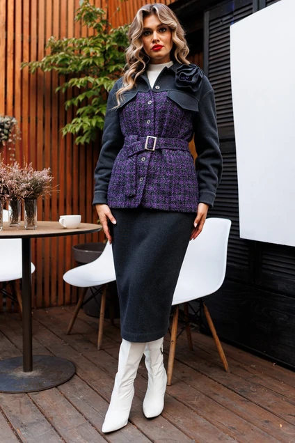 Сегодня мы представляем Вам новинку от бренда "МОДА-ЮРС". Жакет из ткани в клетку в тандеме с трикотажным полотном на флисе и юбкой. Жакет полуприлегающего силуэта, линия талии спущена. Перед и спинка с кокетками. Рукав рубашечный, одношовный, снизу на притачной манжете. Застежка на петли-пуговицы. Жакет дополнен поясом, что позволяет регулировать ширину по линии талии. Жакет на подкладке. Юбка прямая, зауженная к низу, сзади со средним швом, который переходит в шлицу. Сверху юбка на резинке, в которую через петли-пуговицы продет шнурок, декорированнный металлическими зажимами. Декором и главным акцентом является съемная брошь в форме цветка.