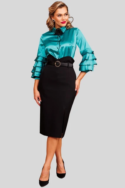 Бренд "Мода-Юрс" представляет Вам новинку - романтичную блузу и сдержанную юбку-карандаш. Блуза прямого силуэта с нагрудной вытачкой, выходящей из бокового шва. В боковых швах блузы разрезы. Воротник рубашечный. Застежка на петли-пуговицы. Рукав одношовный с волонами, снизу с притачной манжетой на резинке. Юбка прямая, зауженная к низу, спереди с разрезом. Линия талии завышена. Верхний край фигурной формы. Декором юбки являестя съемный пояс, что позволяет регулировать ширину по линии талии. Главным акцентом комплекта является съемная брошь.