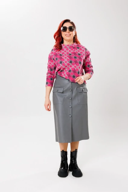 Юбка А-образного силуэта на притачном поясе из экокожи на текстильной основе без подкладки. По переду юбки центральная застежка на петли-пуговицы, талиевые вытачки и накладные карманы с клапаном. Заднее полотнище на кокетке и с центральным швом.