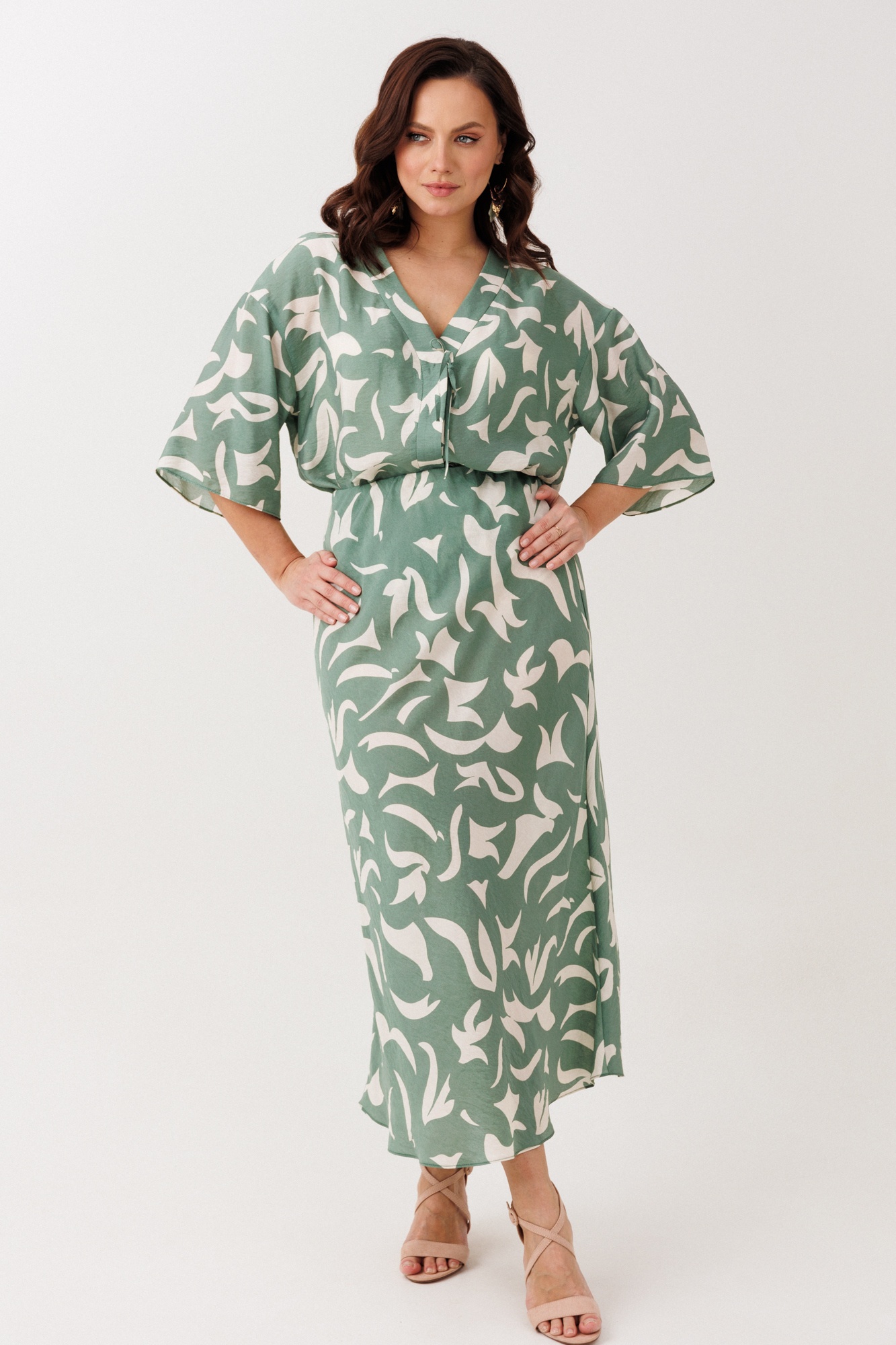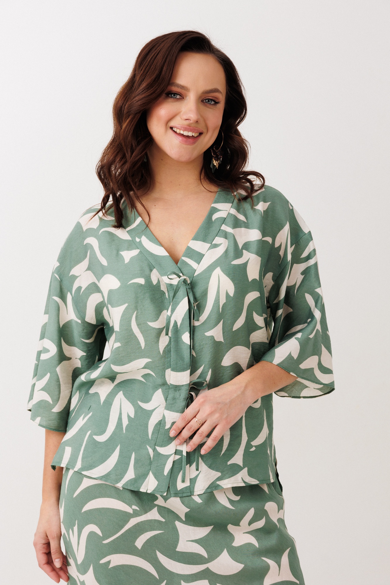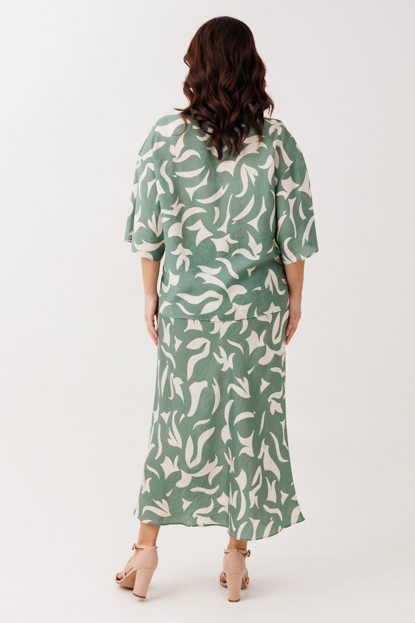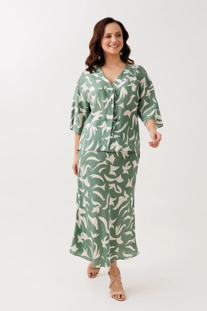 Костюм с юбкой 244 Мублиз – это нарядно-офисное решение из коллекции бренда Мублиз, воплощающее стиль и комфорт. Комплект состоит из блузы прямого силуэта и юбки, выполненных из лёгкой струящейся вискозы, которая не тянется, обеспечивая комфортное прилегание. Блуза с V-образным вырезом горловины и спущенной линией плеч дополнена декоративными шнурками и пришивной кнопкой на застежке-планке, что добавляет интересные акценты. Расширенные рукава и боковые разрезы усиливают изящность изделия. Юбка, расширяющаяся к низу и с поясом на эластичной резинке, придаёт лёгкость образу. Приятный зелено-бежевый цвет и изящный растительный принт сделают этот костюм идеальным для весенне-летнего периода и офисных выходов.