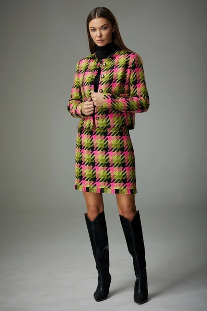 Жакет с цельно-бортовой застежкой на петли и пуговицы, горловина округлой формы. По переду расположены нагрудные вытачки и планка. Горизонтально направленные вытачки и планка оформлены бахромой из основной ткани, бахрома также расположена по правому борту и горловине, по переду и спинке. Рукав двухшовный. По переду – рельефы, в которых расположены карманы. Юбка прямая, короткая, по низу расположена бахрома из основной ткани. Верхний срез юбки обработан поясом. В левом боковом шве расположена застежка на молнию. Пуговицы контрастной расцветки.