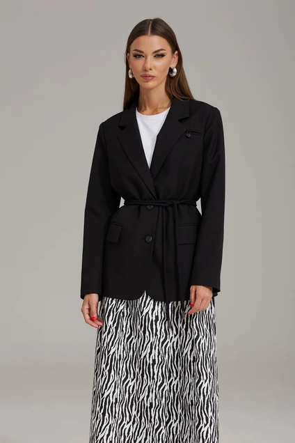 Комплект женский, состоящий из жакета и юбки, выполнен из двух видов ткани.