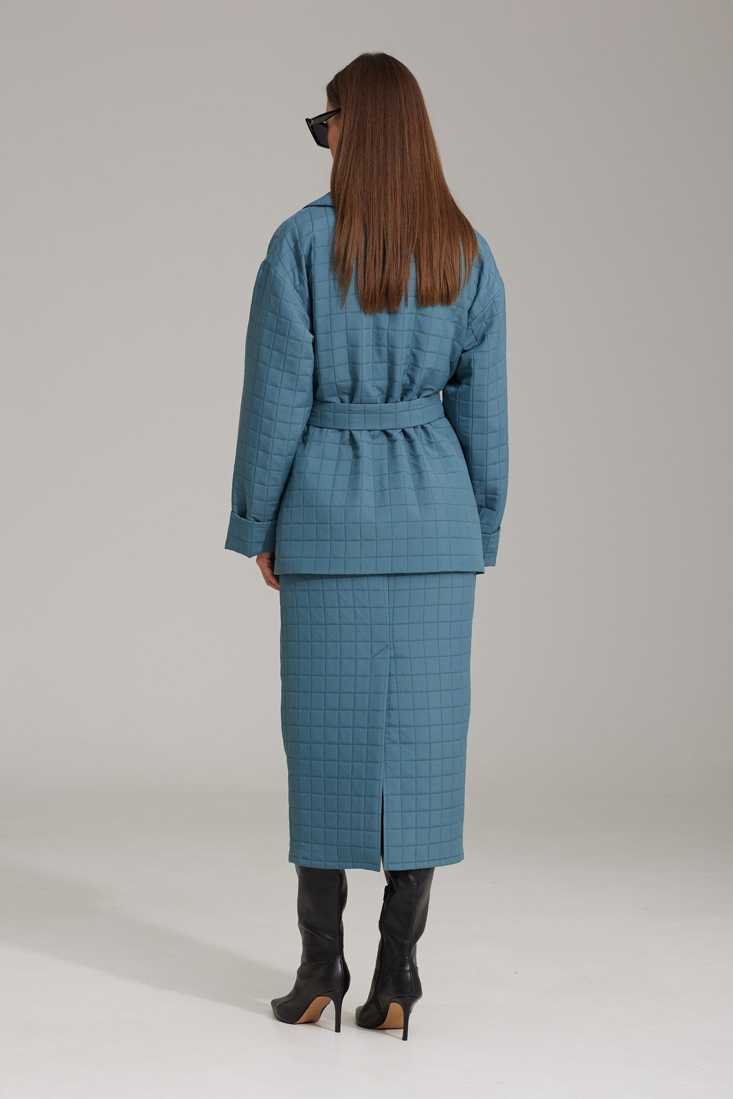 Юбка прямая, к низу заужена, с завышенной талией (цельнокроеным поясом). На переднем полотнище попарно расположены талевые вытачки. На заднем полотнище расположен средний шов со шлицей и застежка на тесьму-молнию, талевые вытачки. Длина юбки «миди».