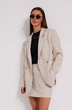 Жакет свободной формы с расширенной линией плеча, на двубортную застежку. На жакете так же пришита третья пуговица, при застегивании на нее силуэт меняется на приталенный. Воротник пиджачного типа, борта внизу закругленные. Рукав длинный двухшовный. По переду отрезной бочок и прорезные карманы в рамку, с клапанами. На правой полочке сверху листочка с втачными концами. Спинка со средним швом и бочками.