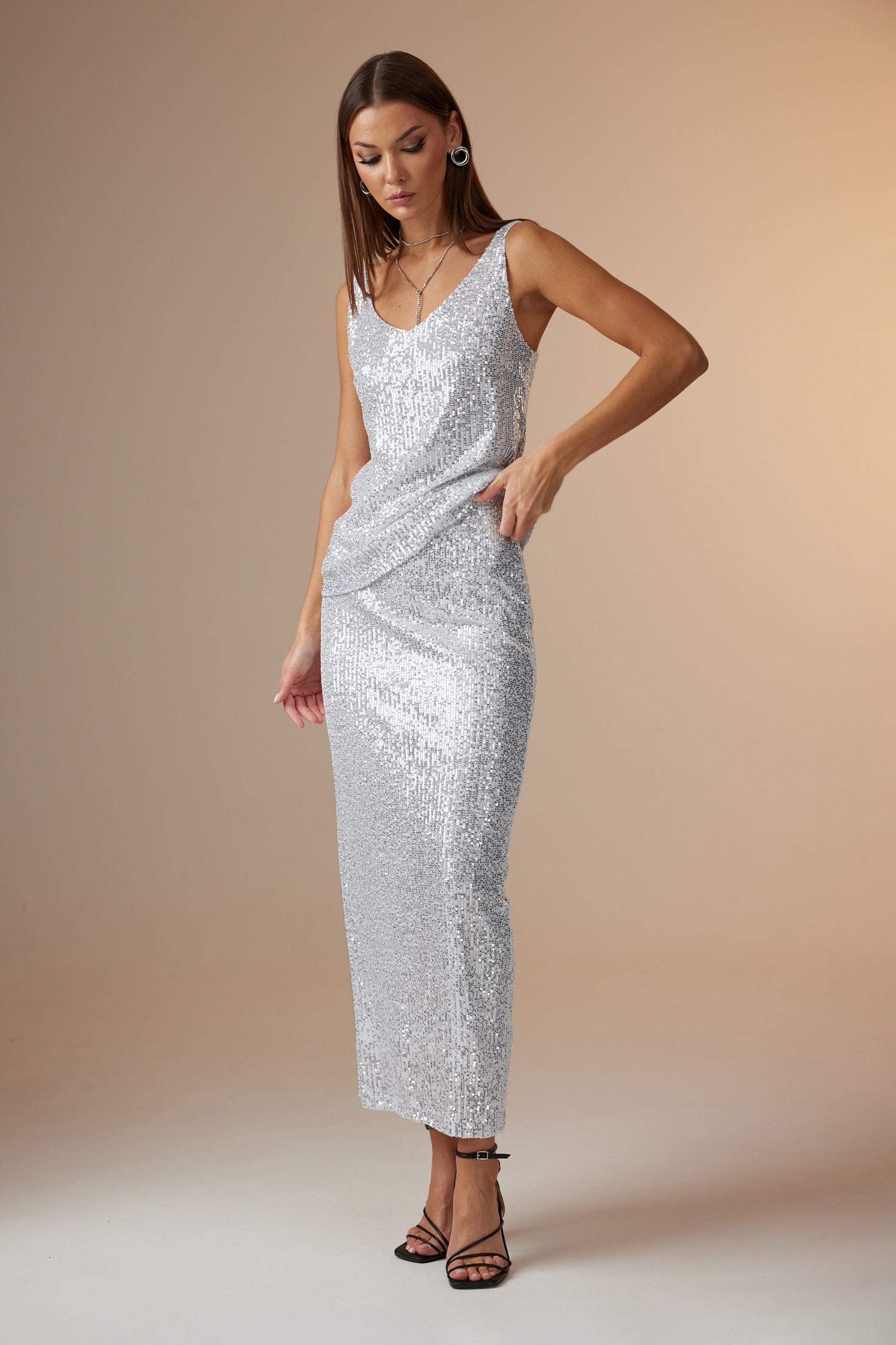 Топ: полуприлегающего силуэта на бретелях, выполнен из отделочной трикотажной ткани, с «пайетками», на трикотажной подкладке. Вырез горловины «V»-образный, с регулируемыми бретелями по длине.