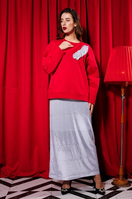 Костюм двухпредметный: состоит из юбки и джемпера. Джемпер свободного силуэта с округлой горловиной. Рукав комбинированного кроя, с передними и задними швами. Верхняя и нижняя часть рукава образуют между собой разрез. Карманы в боковых швах. По переду изделие декорировано фигурной фалдой из пайеток. Коктейльная юбка макси на резинке, драпирующаяся, расширенного силуэта. В бёдрах свободная. Изделие на подкладке. Низ-100% пэ, пайетки