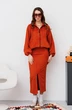 Костюм двухпредметный: состоит из джемпера и юбки. Джемпер объема оверсайз прямого силуэта. По полочке и спинке вертикальные рельефы. Рукав длинный, широкий, покроя реглан. Воротник-стойка. Застежка центральная на молнию. По низу изделия протянут эластичный шнур с фиксатором. Юбка длиной миди прямая на резинке, немного расширенного силуэта. Разрез по переду. Изделие без подкладки.