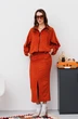 Костюм двухпредметный: состоит из джемпера и юбки. Джемпер объема оверсайз прямого силуэта. По полочке и спинке вертикальные рельефы. Рукав длинный, широкий, покроя реглан. Воротник-стойка. Застежка центральная на молнию. По низу изделия протянут эластичный шнур с фиксатором. Юбка длиной миди прямая на резинке, немного расширенного силуэта. Разрез по переду. Изделие без подкладки.