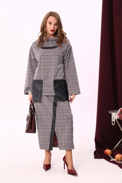 Костюм комбинированный двухпредметный: состоит из джемпера и юбки. Джемпер прямого свободного силуэта длиной до линии бедер, воротник хомут, рукав одношовный, втачной длиной до запястья. Спинка цельнокроеная. Перед состоит из двух частей- верхней и нижней. По нижней части переда сверху по центру вставка из отделочной ткани. По нижней части переда боковые накладные карманы из отделочной ткани, уходяшие в боковой шов, длинее линии низа переда вровень с линией низа спинки. Юбка на резинке прямого кроя симитацией запаха из отделочной ткани.