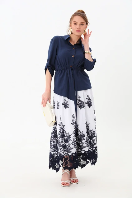 Костюм двухпредметный: состоит из жакета и юбки. Жакет прямого силуэта, воротник пиджачного типа, рукав одношовный, втачной с незначительно спущенной линией плеча, длиной три четверти, с патой. По линии ткани настрачная кулиса с завязками из основной ткани. Застежка центрально-бортовая. Линия низа верхней части фигурная ассиметричная. Юбка - солнце макси с узким поясом на резинке.