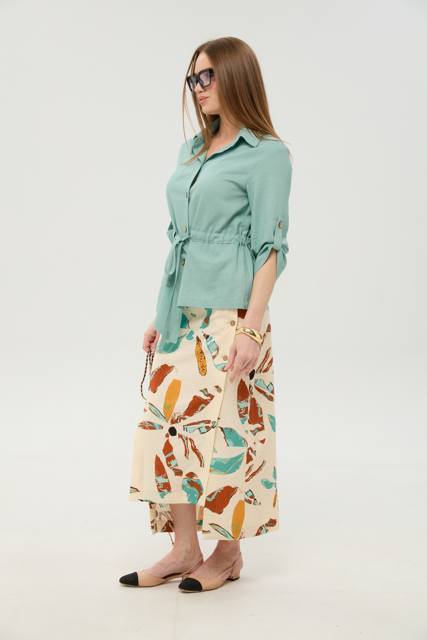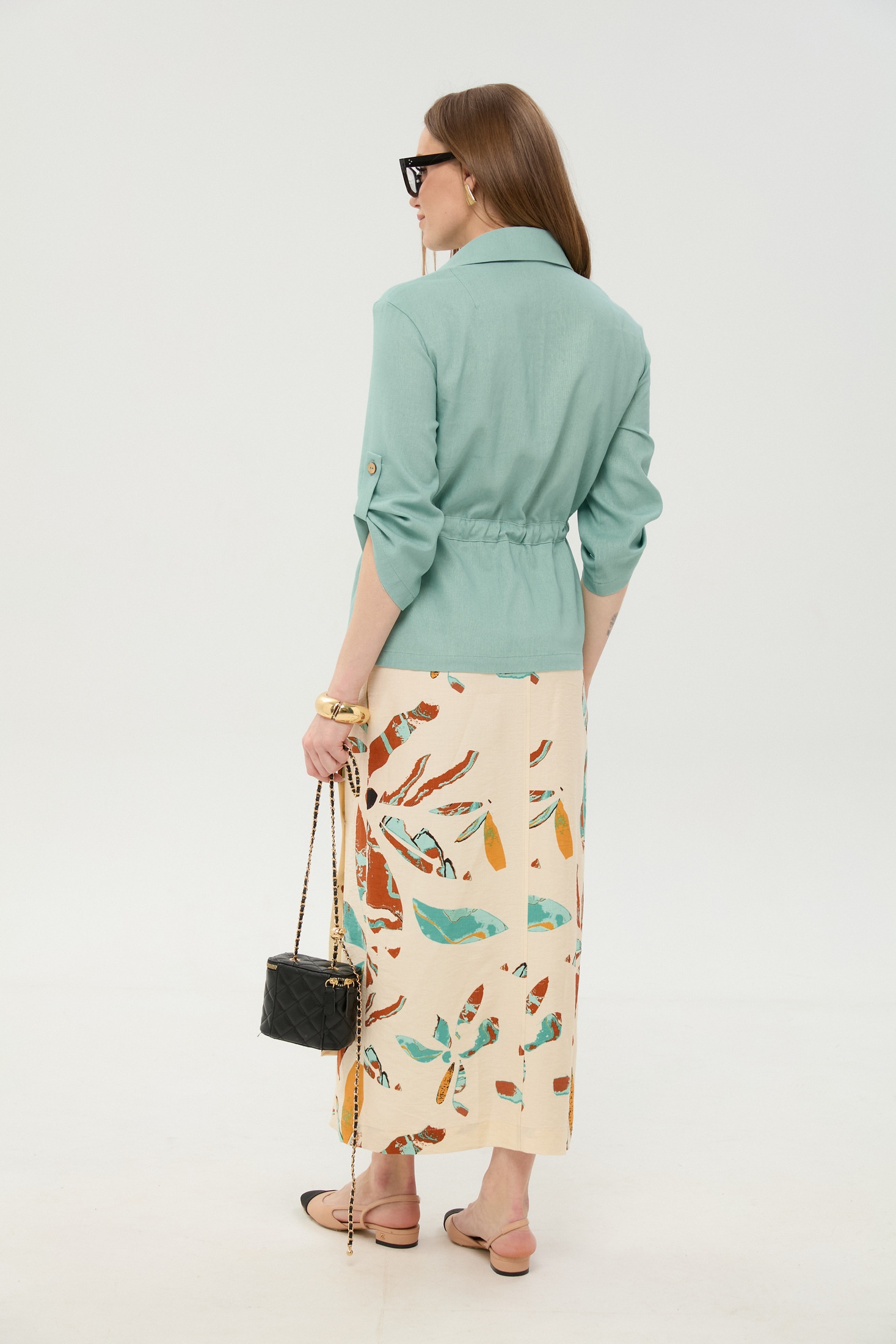 Костюм с юбкой 980-2 мята и бохо мультиколор NikVa. Коллекция бренда NikVa представляет двухпредметный костюм, состоящий из жакета и юбки, идеально подходящий для весенних и летних прогулок. Изготовленный из лёгкой смеси льна, вискозы и хлопка, костюм обеспечивает комфорт и дыхание кожи. Жакет прямого силуэта с асимметричным низом и застежкой на центрально-бортовую молнию. Воротник пиджачного типа и три четверти рукава с патой обеспечивают стиль и комфорт. Настраничная кулиса с завязками добавляет уникальности. Юбка миди с асимметричным низом, дополненная резинкой на поясе для идеальной посадки. Рисунок бохо мультиколор добавляет яркости образу. Карманы в боковых швах добавляют функциональности. Идеально для стильных и повседневных выходов.