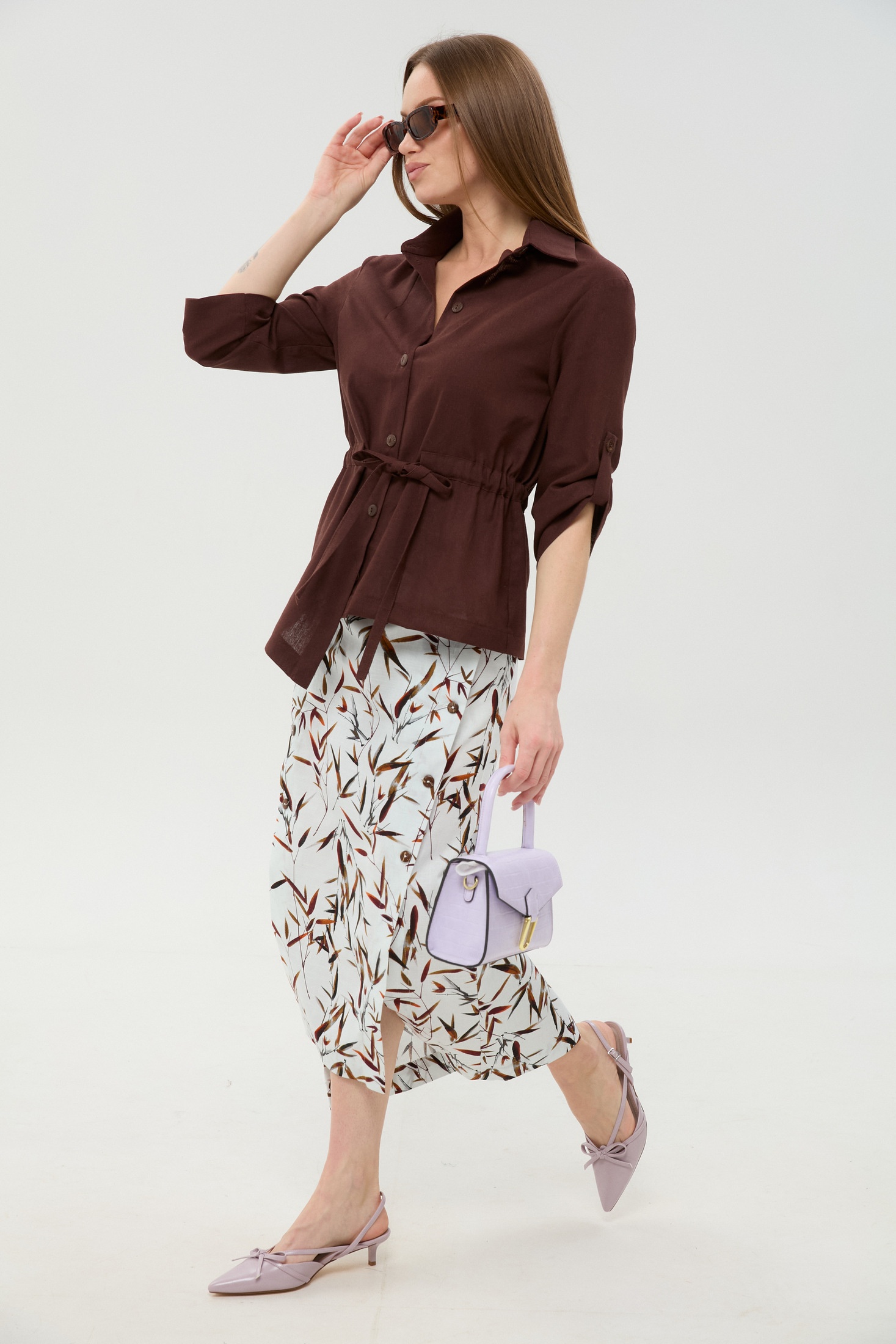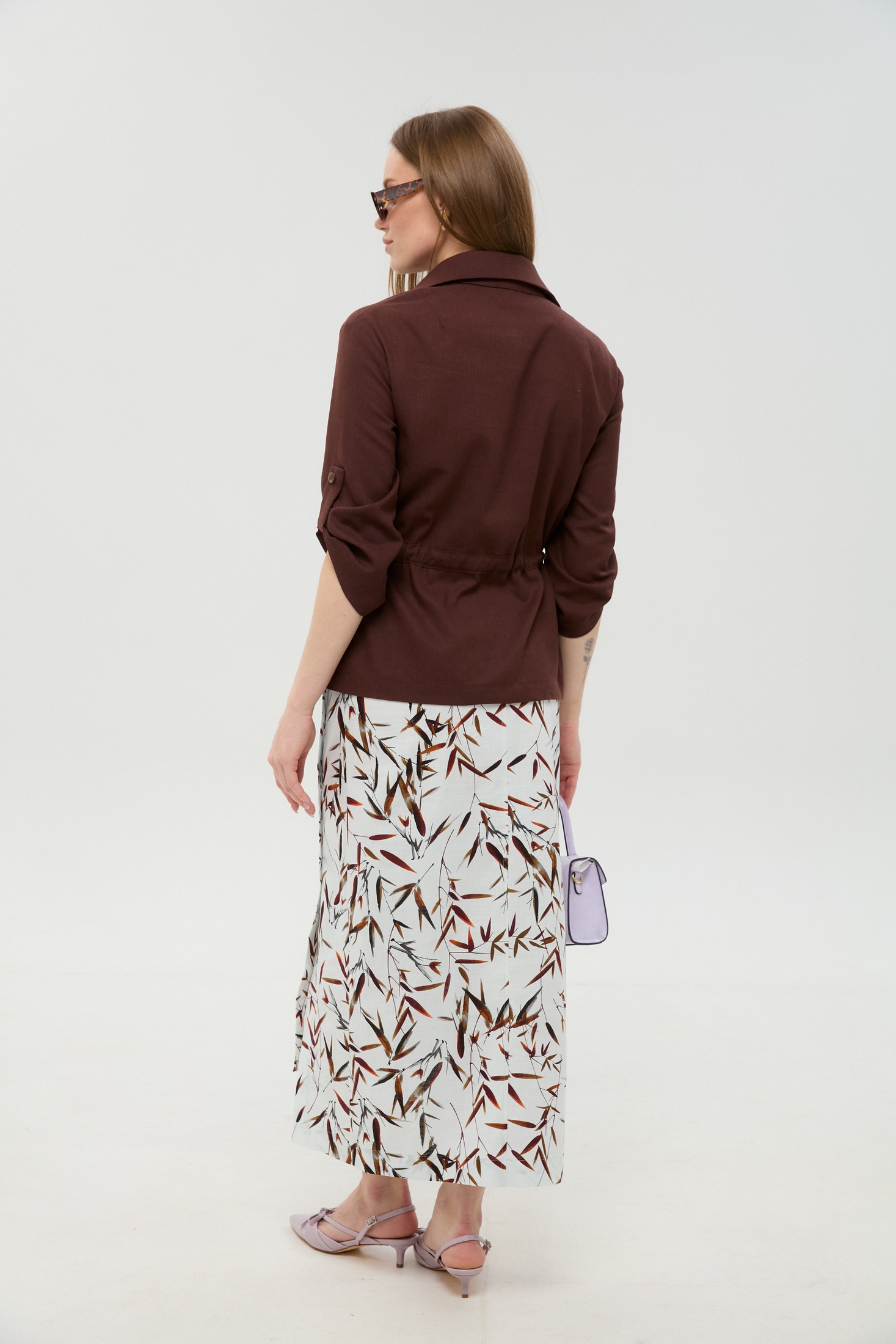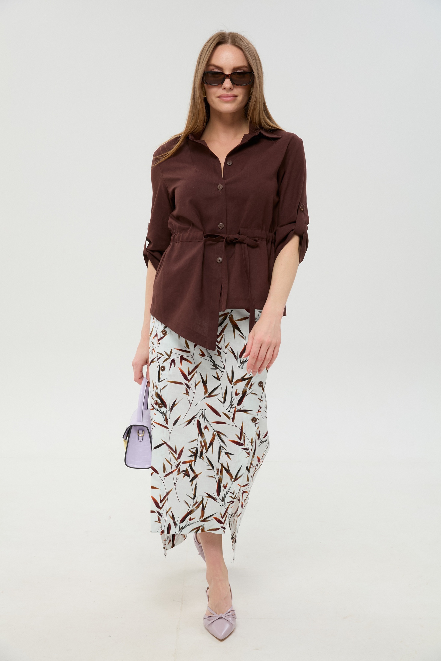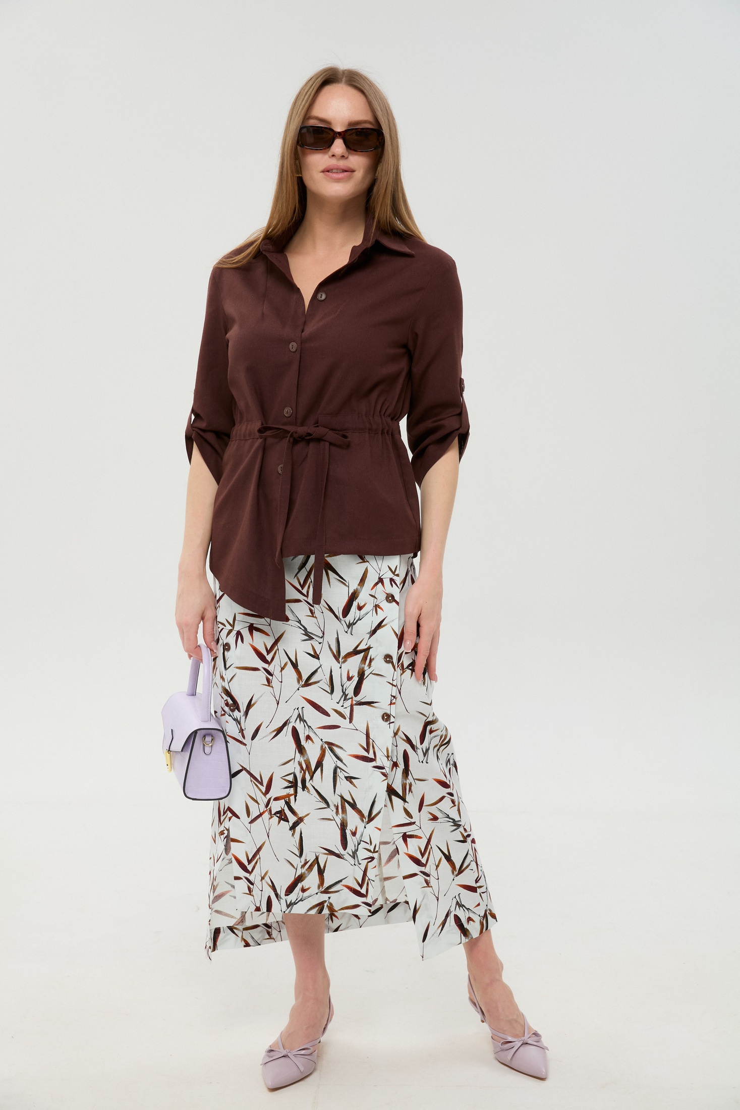 Костюм с юбкой 980-6 шоколад и листья мультиколор NikVa — стильный выбор для эффектного образа. Коллекция бренда NikVa отличается использованием натуральных материалов, таких как лён, вискоза и хлопок, что придаёт костюму легкость и комфорт. Жакет с воротником пиджачного типа и три четверти рукавами украшен завязками и удобной кулиской по линии талии. Ассиметричный крой низа и фигурные линии добавляют динамичности образу. Юбка миди с расклешенным к низу силуэтом и асимметричным кроем доступна с удобной резинкой на поясе. Принт с листьями мультиколор создаёт легкое весеннее настроение. Отлично подходит для бизнес-кэжуал стиля и повседневных летних прогулок.