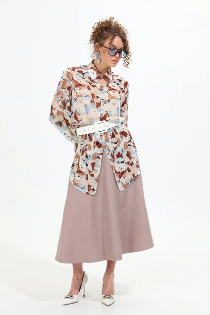 Этот изысканный женский костюм состоит из блузы и юбки, представляя собой идеальный выбор для элегантного образа. Блуза выполнена в свободном прямом крое с V-образным вырезом и стояче-отложным рубашечным воротником, который застёгивается на декоративную пуговицу. Особенное внимание привлекает её принт: живописные размытые пятна в бежевых, коричневых, синих и белых тонах, создающие динамичный и привлекательный вид. Рукава блузы объёмные, собраны на манжетах, благодаря чему создаётся легкое и игривое настроение. Юбка-солнце до середины икры выполнена из гладкой ткани приятного бежевого оттенка, что создает прекрасный контраст с многогранным принтом блузы. Элегантный узкий пояс, удобные карманы по бокам и застёжка на молнию с петлей и пуговицей по спинке обеспечивают комфортное ношение. В комплект также входит стильный ремень из экокожи, который идеально дополняет образ, подчеркивая талию. Данный костюм идеален для деловых встреч, офиса или торжественных событий, где вам хочется выглядеть особенно женственно и модно.
