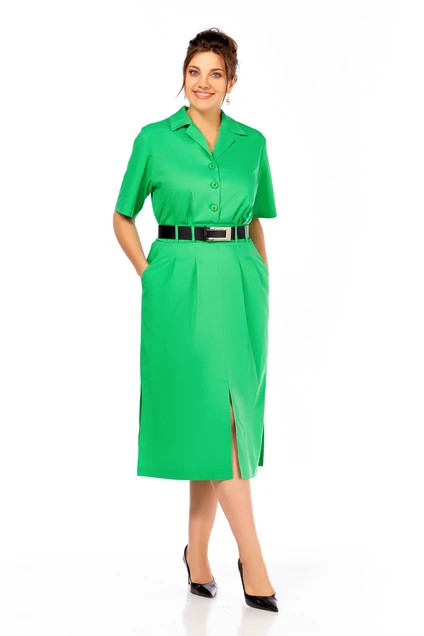 Костюм женский, рубашка и юбка. Костюм выполнен из легкой ткани со льном, юбка на подкладке. В комплекте пояс. Рубашка с воротником пиджачного типа, застежкой на пуговицы. Рукав короткий. Юбка слегка расклешенная, спереди шов, с разрезом. На поясе, со шлевками, в среднем шве спинки потайная молния. Карманы к боковым швам и разреры. Длина рубашки 60см, длина юбки 78см