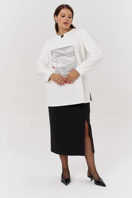 Невероятно комфортный трикотажный комплект состоит из джемпера и юбки. Джемпер свободного покроя с круглой горловиной. Рукав втачной, из контрастной ткани, полномерный по обхвату, на манжете. Для удобства в боковых швах разрезы. На полочке оригинальная фантазийная вышивка контрастными нитями. Юбка прямого кроя, с разрезом на ноге с высокой посадкой. Пояс притачной на резинке. В боковом шве молния и петля-пуговица. Оригинальный разрез по переду придает образу игривость. Оригинальный юбочный комплект oversize благодаря качественным лекалам хорошо садится по фигуре, не мнётся, удобен для особых случаев и прекрасно выглядит! Ткань хорошо тянется и это позволяет вам комфортно себя чувствовать. Комплект подойдет для прогулки, встречи с друзьями. Вы с удовольствием оцените крой и удобство комплекта.